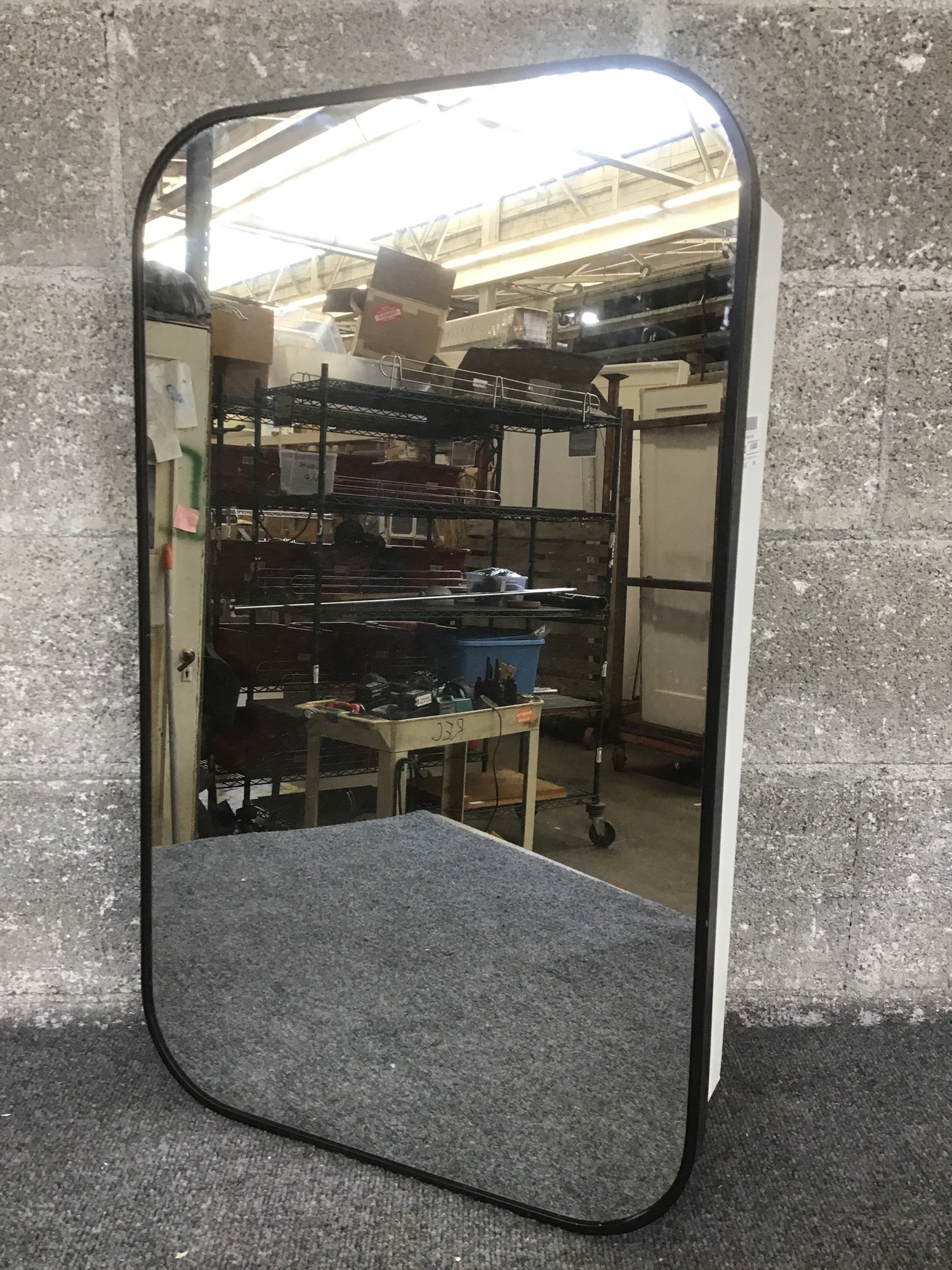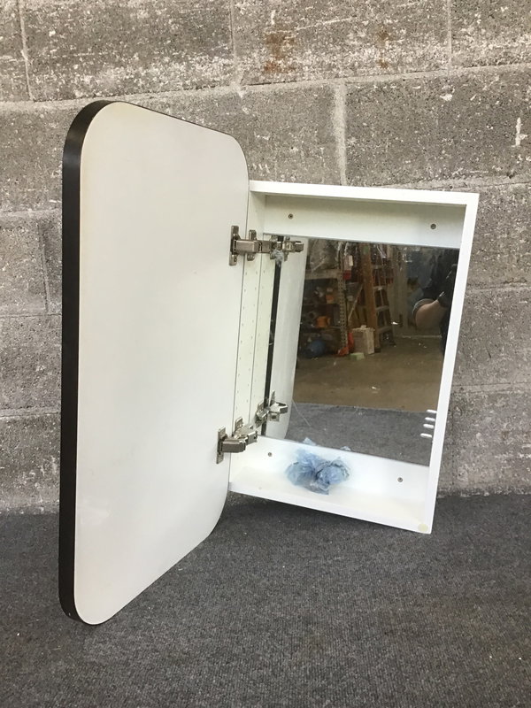 Modern black medicine cabinet with rounded corners. Few scuffs but overall in good shape.