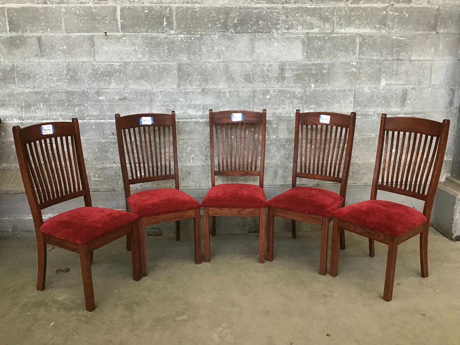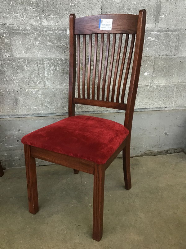 Set of five solid wood chairs with upholstered velvety seats, sold as a set of five.