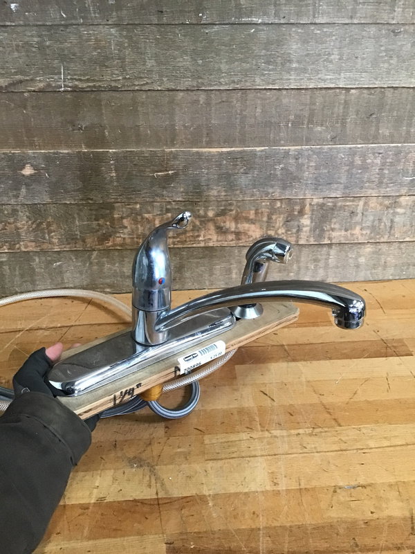 Moen single handle kitchen sink faucet with hose and a polished chrome finish. Shows signs of general wear from use. Could use a good clean, but looks to be in overall good condition.