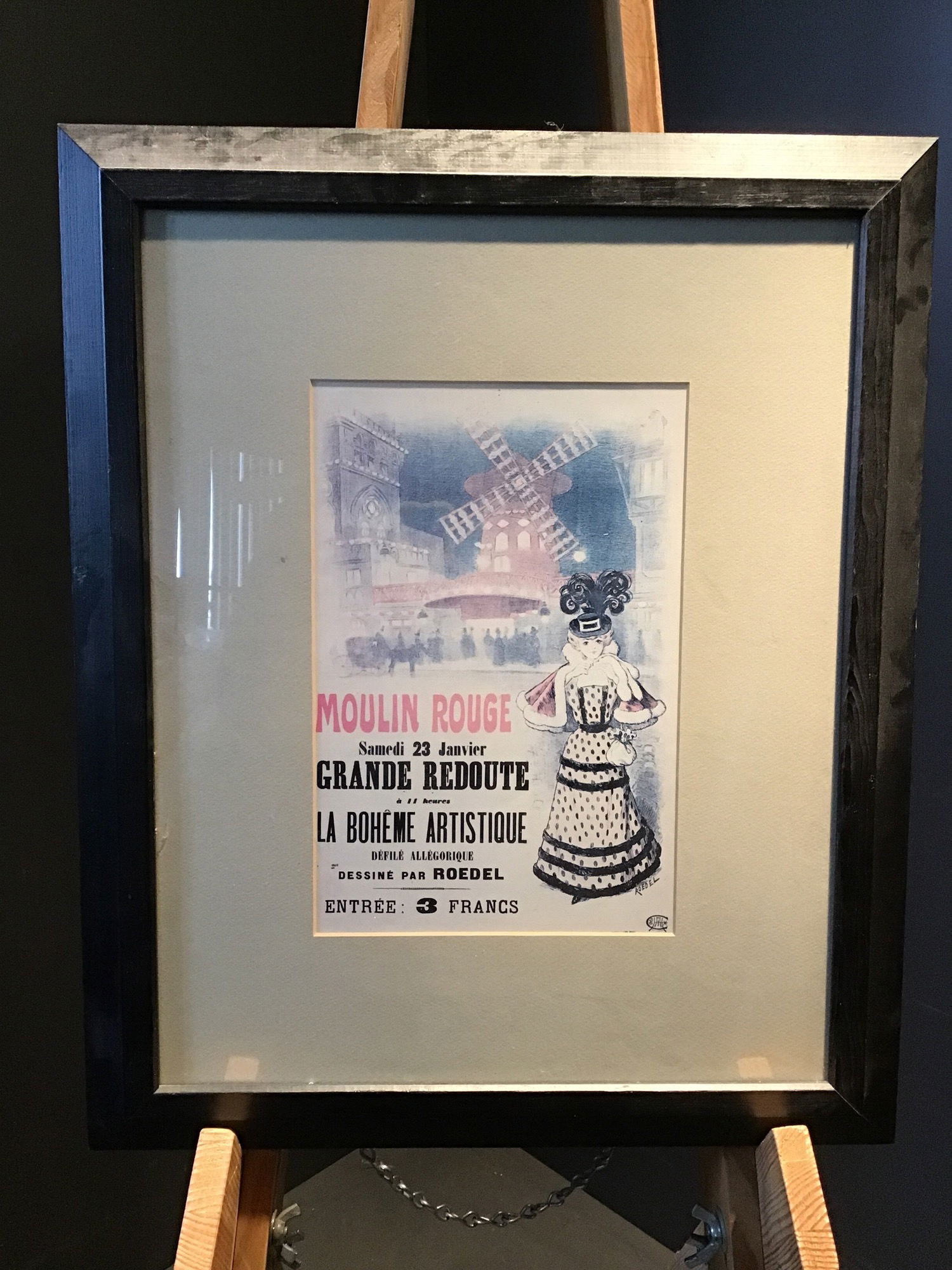 Poster for an old advertisement for the famed Moulin Rouge! Long before Ewan Mcgregor and Nicole Kidman the Moulin Rouge has been hosting cabaret shows and this is a print of an ad for one of those shows! Decently framed and entry back then for a show was 3 Francs, oh to be in a world before ticketmaster!