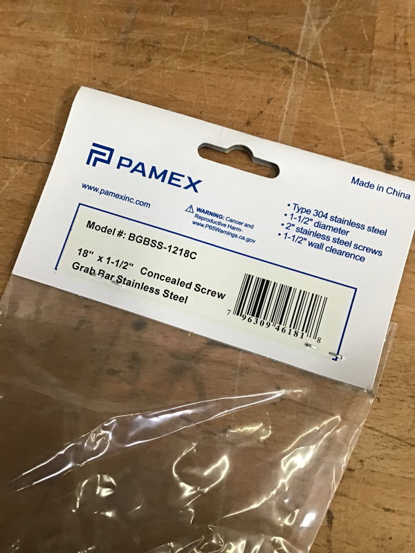 New in packaging, 18" x 1-1/2" concealed screw grab bar with a stainless steel finish. Photo may be representational.