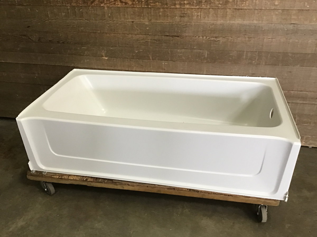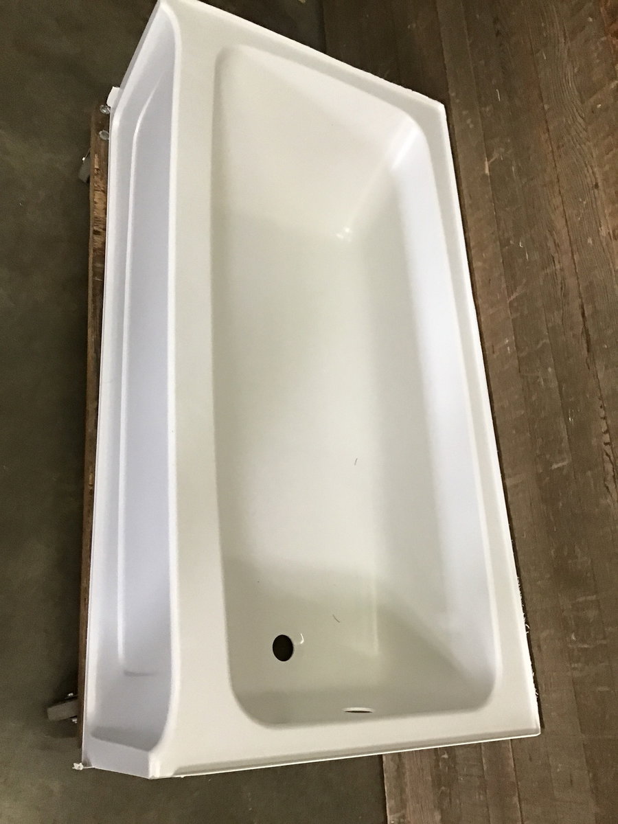 This came to us new in box, a fiberglass bathtub with a right side drain by Sterling. This model sells new at box stores for just over $350, see here for details. Includes hardware and instructions.