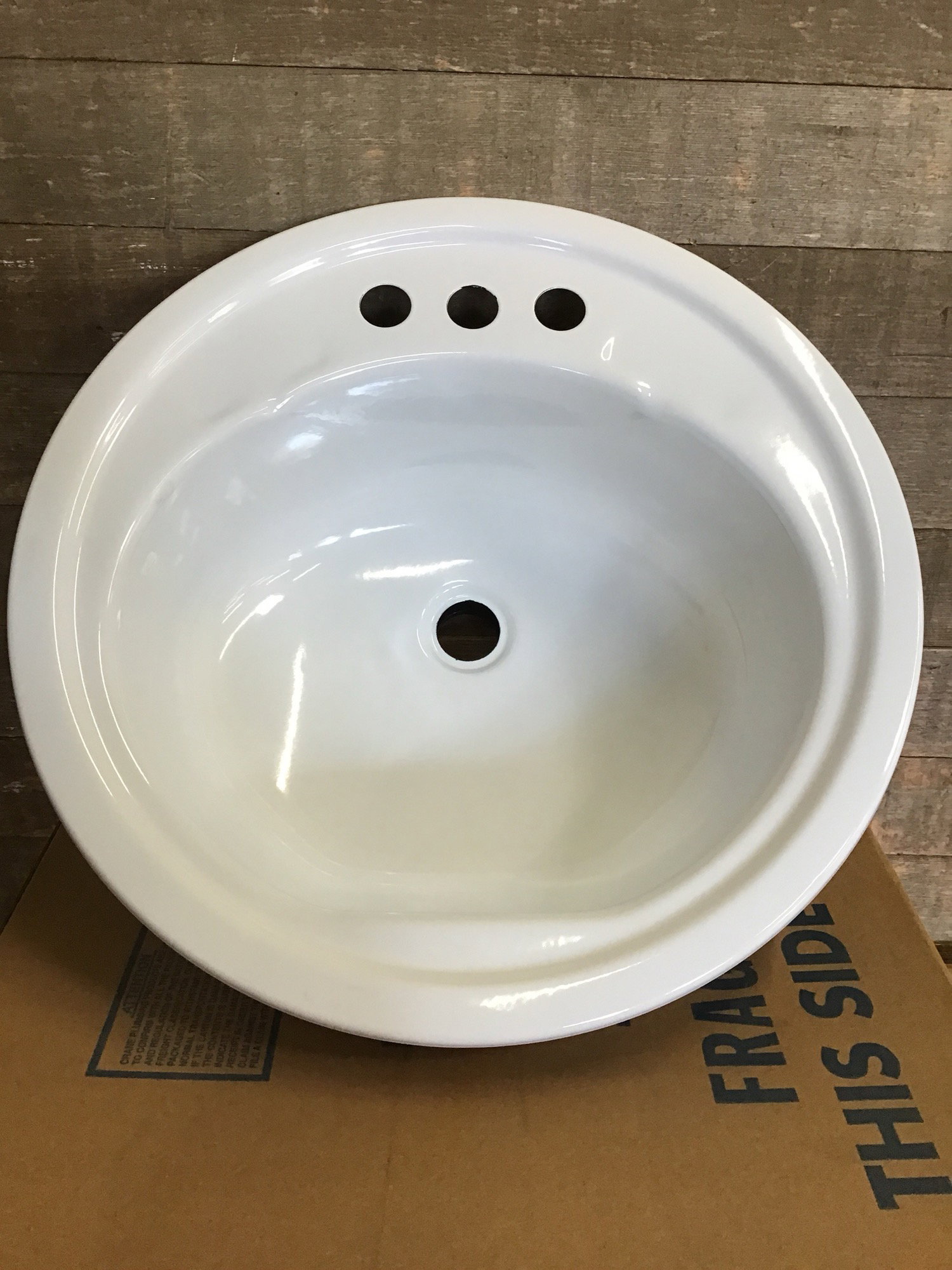 New in box, Crane white enameled steel, self rimming sink. Photo may be representative.