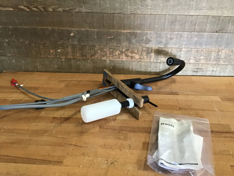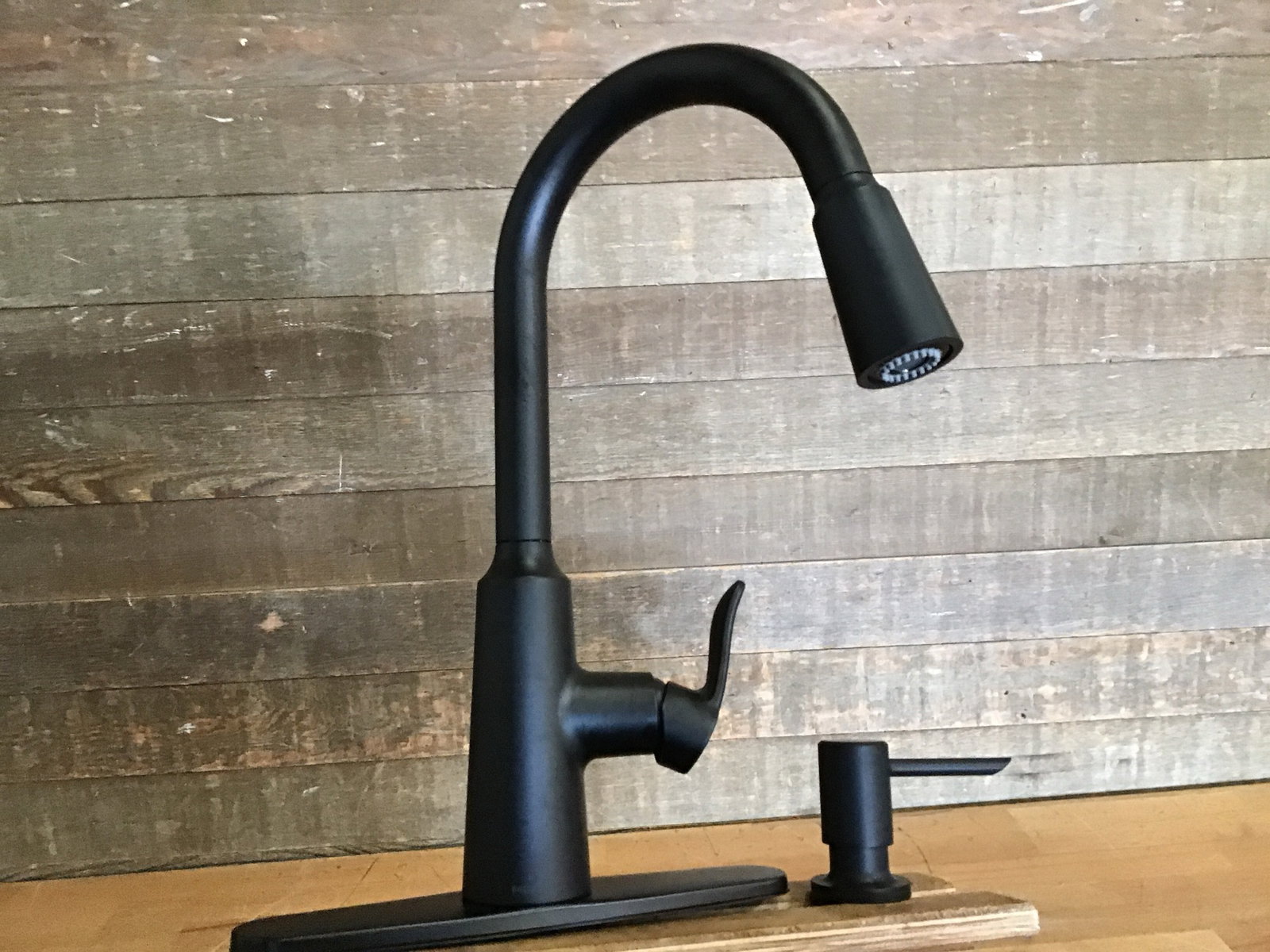 New, never installed Moen one-handle pulldown kitchen faucet with a matte black finish. Came to us new in open box, and includes all the pieces, the soap dispenser, and the instruction manual. This faucet sells new at box stores for $229, see here for details.