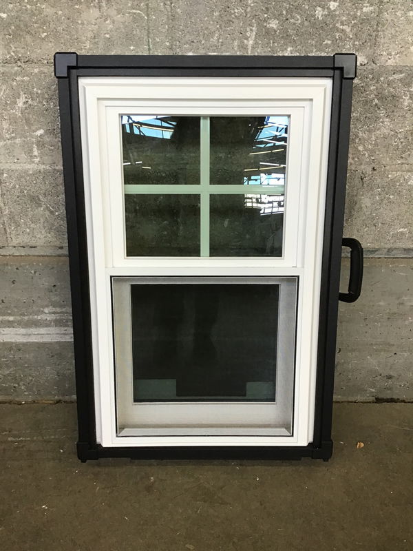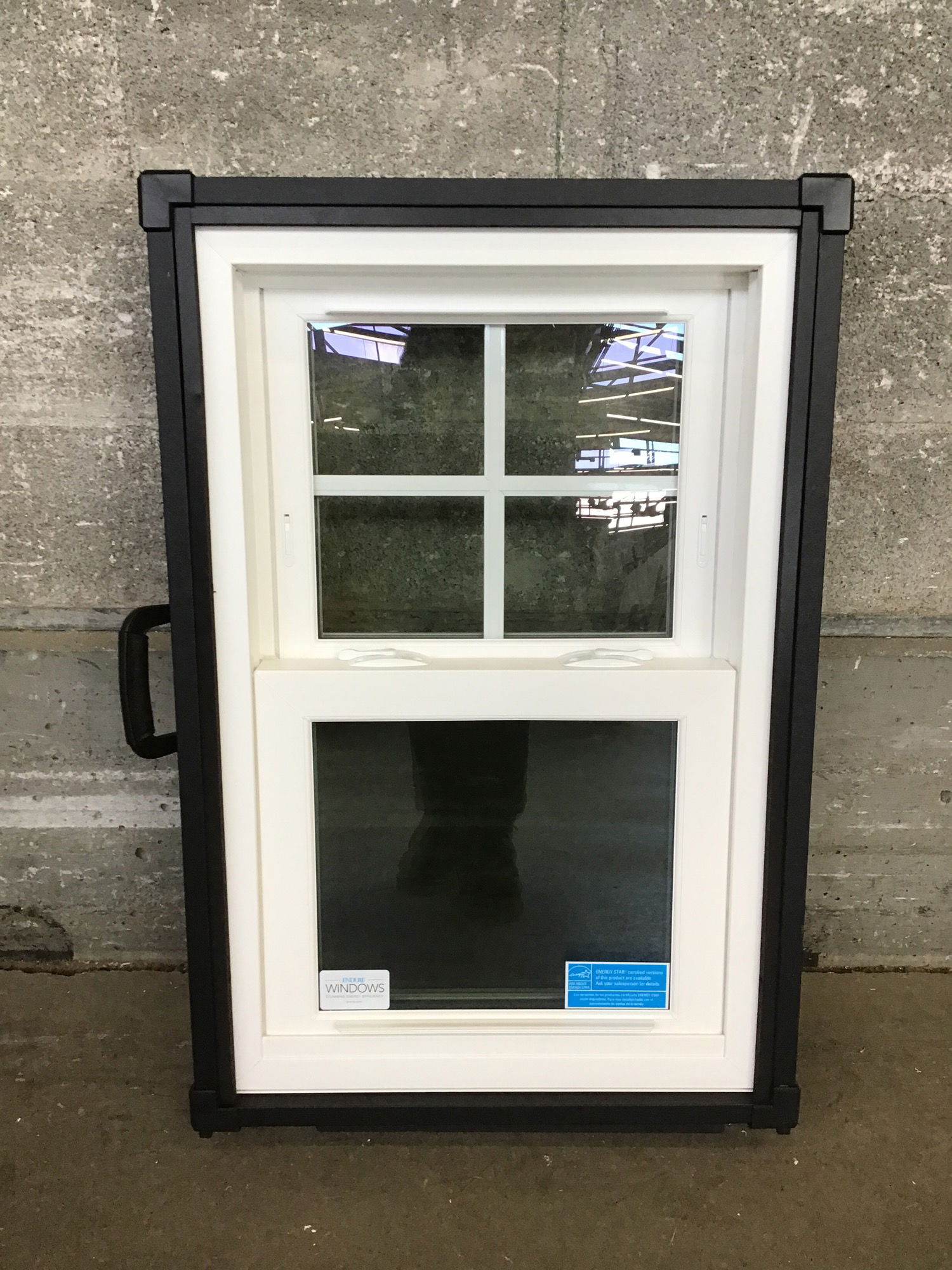 New sample single hung window currently encased in a frame with a handle making it easy to move, it appears the case can be removed.