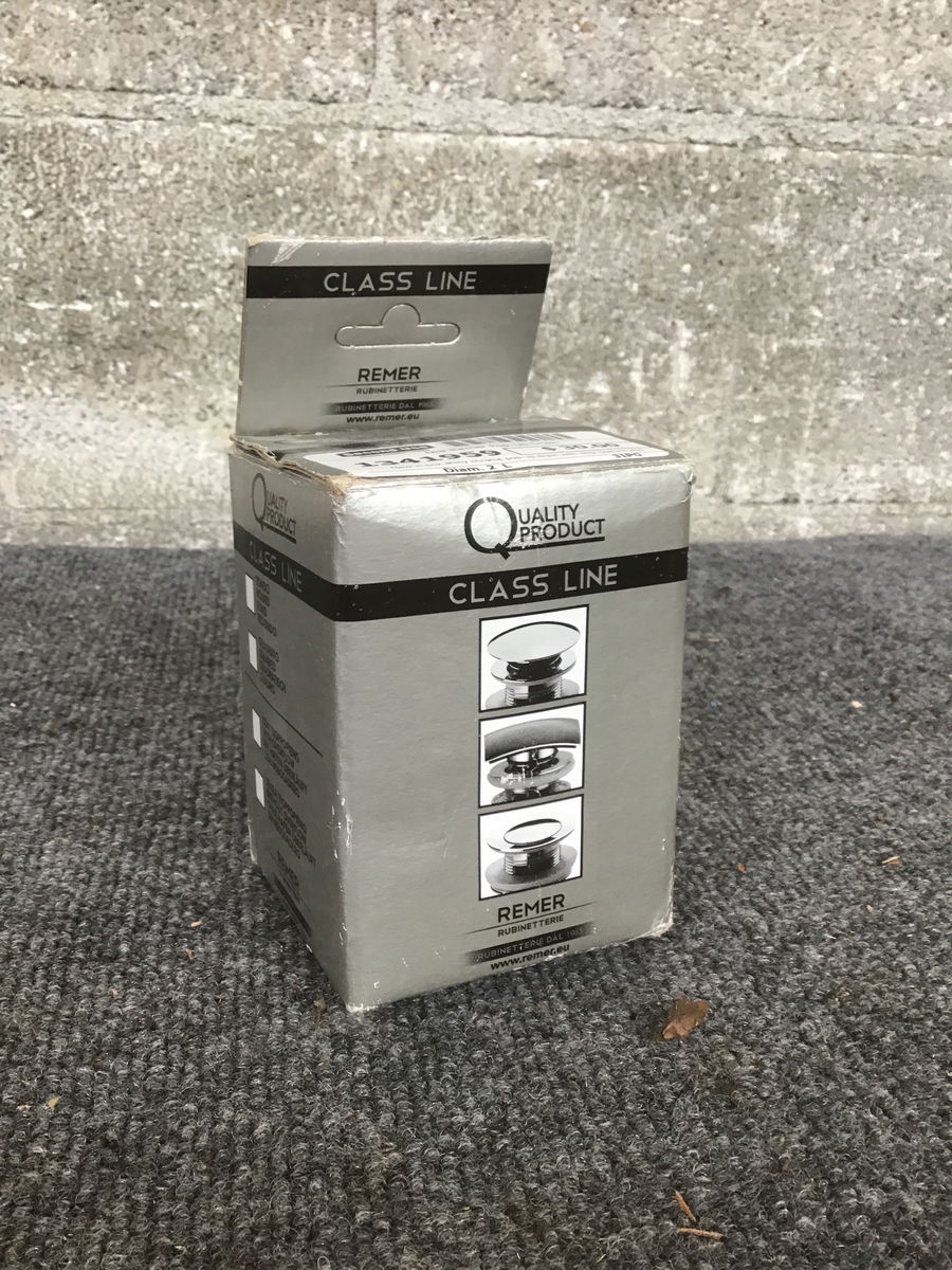 New in box shiny chrome pop-up drain with click feature and overflow from Remer. Find it new at Fergie's for $66!