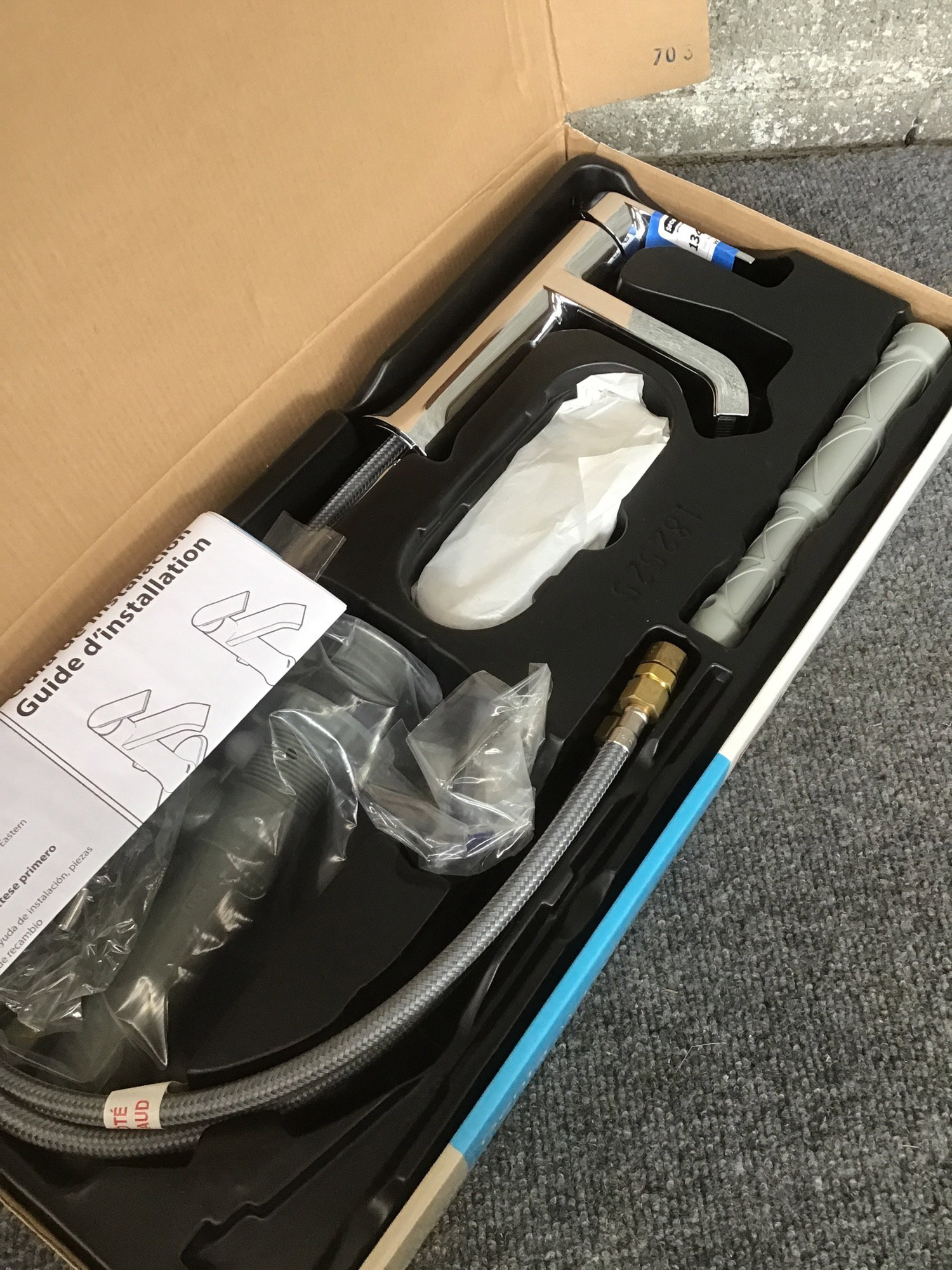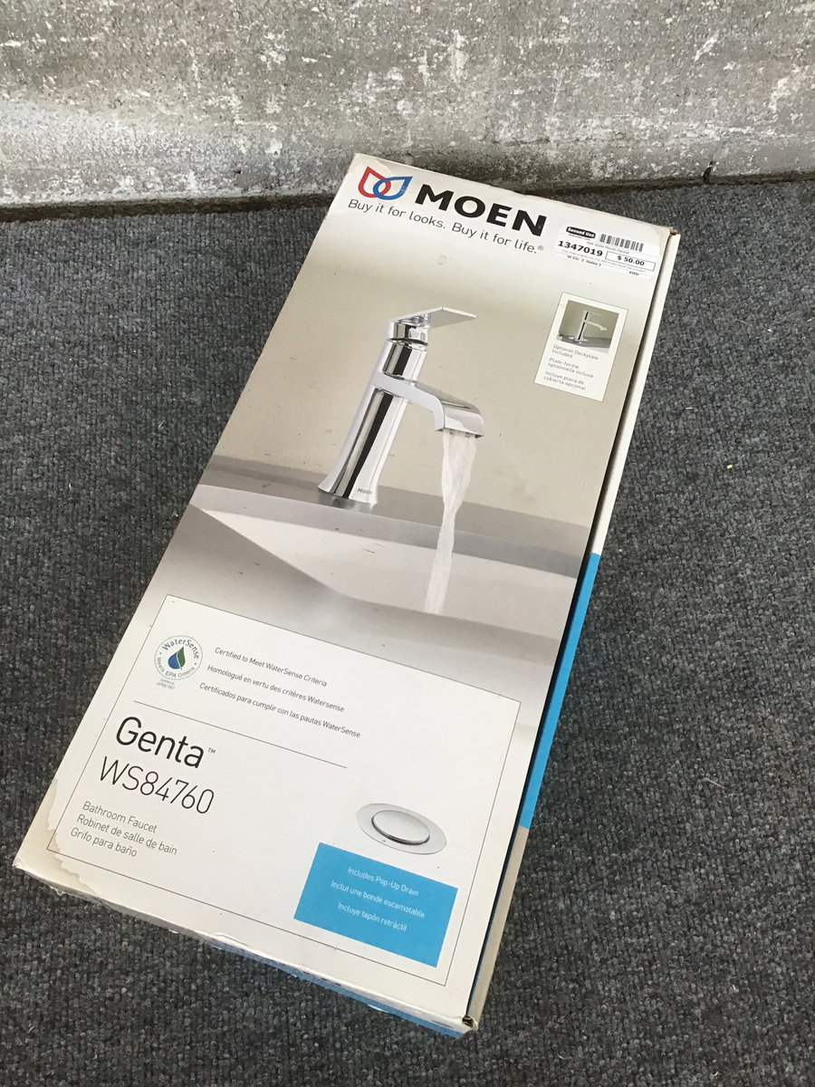 From Moen's Genta line, this New-In-Box faucet has a modern vibe to it and includes an optional deckplate if you have a three-hole sink. Retails new for about $130.