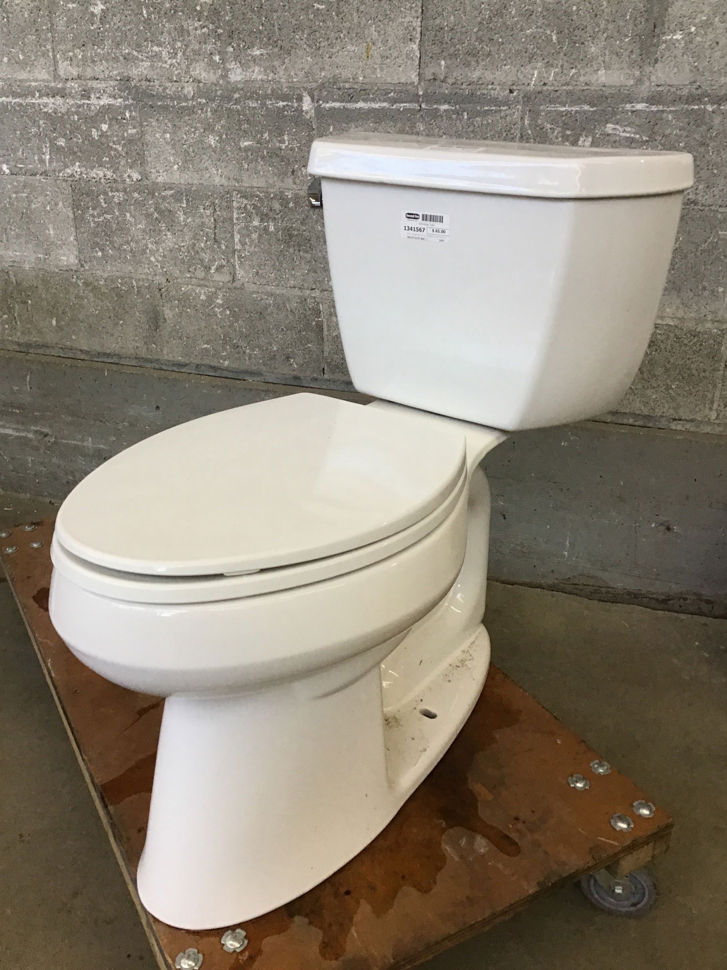 Kohler 1.28 gpf toilet with an elongated bowl and comfort height seat. Just needs a little cleaning to be in fantastic shape!