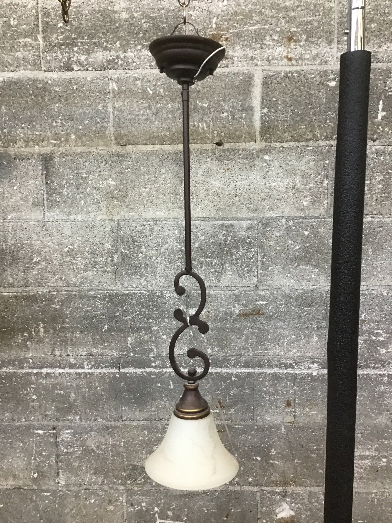 A pendant light fixture with an oil-rubbed bronze finish to its construction with a glass fitter that's white with some little marks that make it look almost like marble.