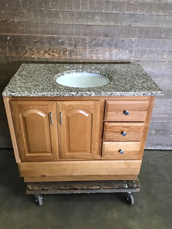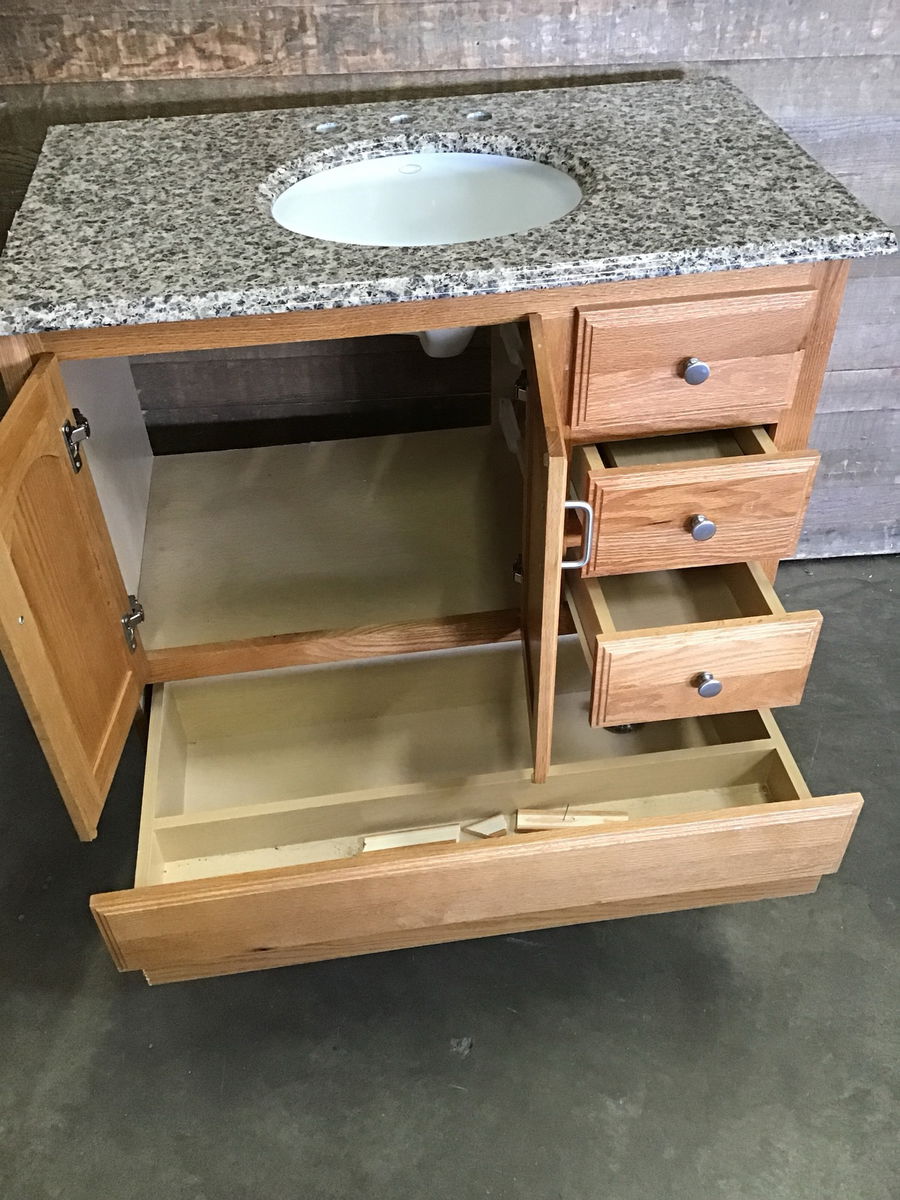 Oak faced bathroom vanity cabinet with a granite countertop and white Kohler sink. Features two doors, two side drawers and a toe kick drawer. There is some water damage in the interior bottom. 8" faucet width. Width does not include 1.75" of countertop overhang.