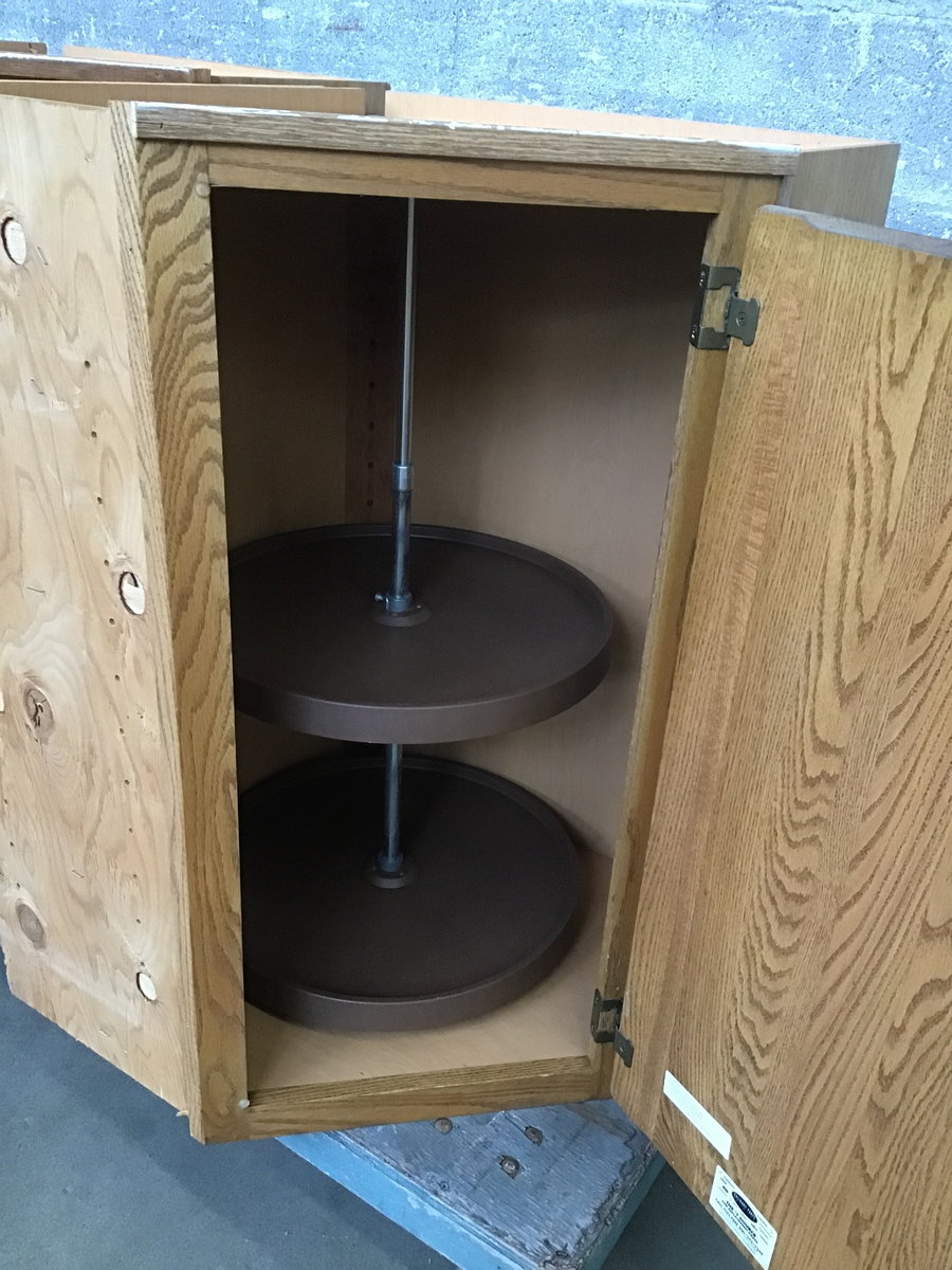 An oak-faced cabinet with a two-level lazy susan inside, built to fit sugnly into a corner. Perfect for a shed, ADU, or workshop!