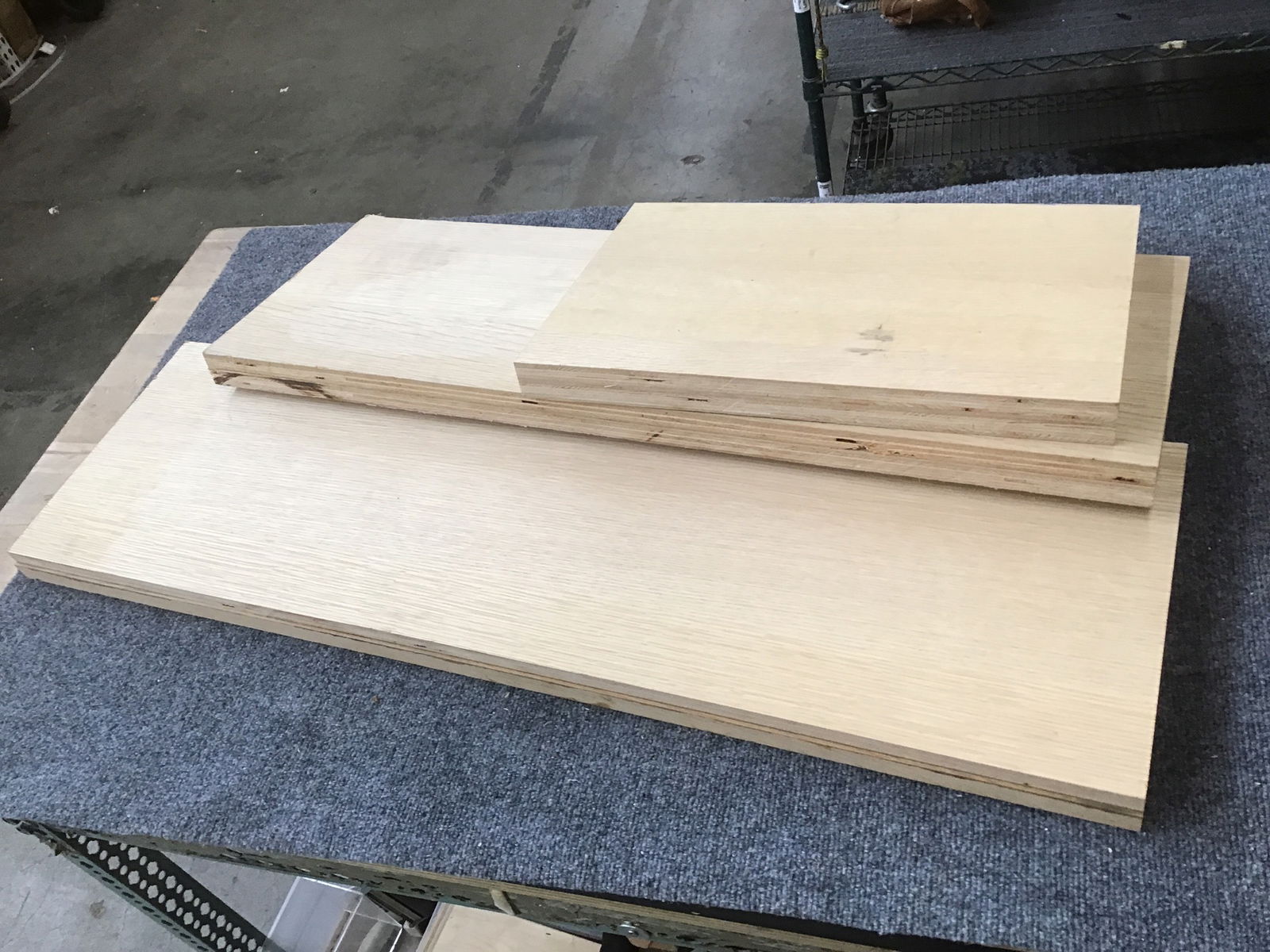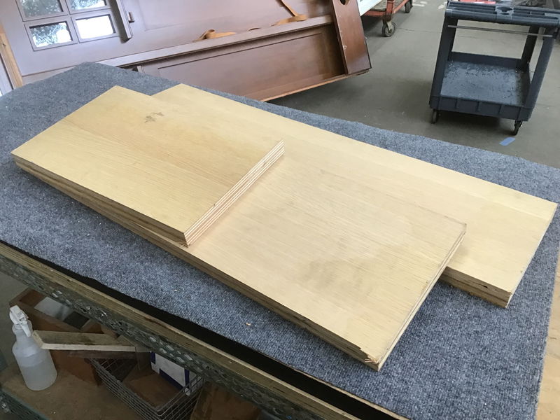 Three shelf-size sheets of 3/4 plywood glued up to make an effective thickness of 1 1/2". Good for a shelving project. They are 19, 35 and 40 inches long, respectively, and about 11 3/4" wide. Looks to be White Oak.