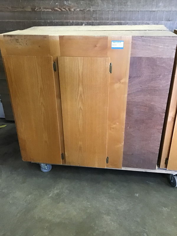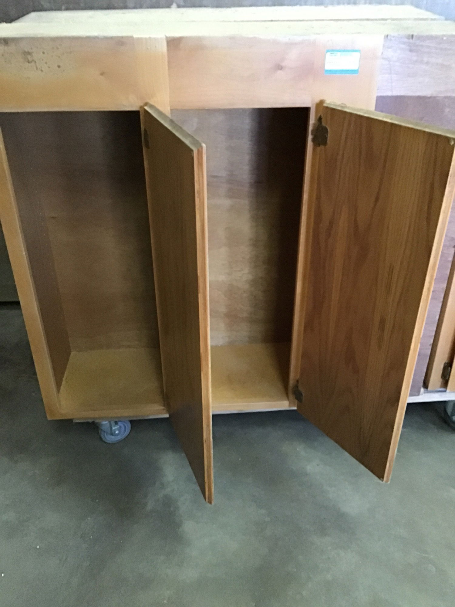 Upper cabinet perfect for a work shop or art studio. Has two doors with a stained Oak face and a blind corner. Combo plywood and particle board box. Has the option for adjustable shelves, though none are included.
