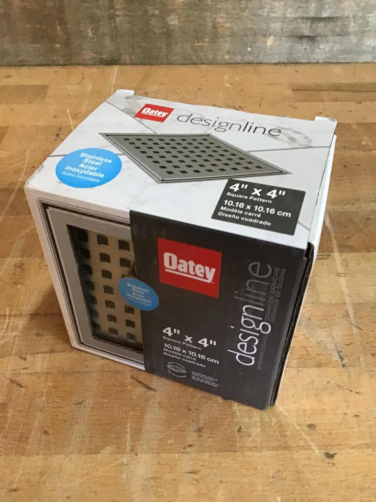 New in box, Oatey 4" x 4" square shower drain with a stainless steel finish. This sells new at box stores for almost $50, see here for details.