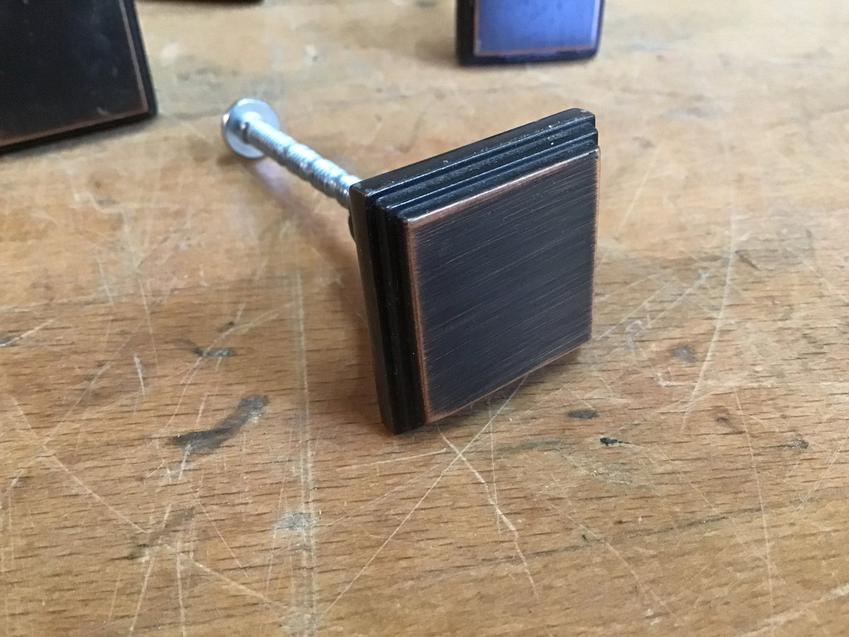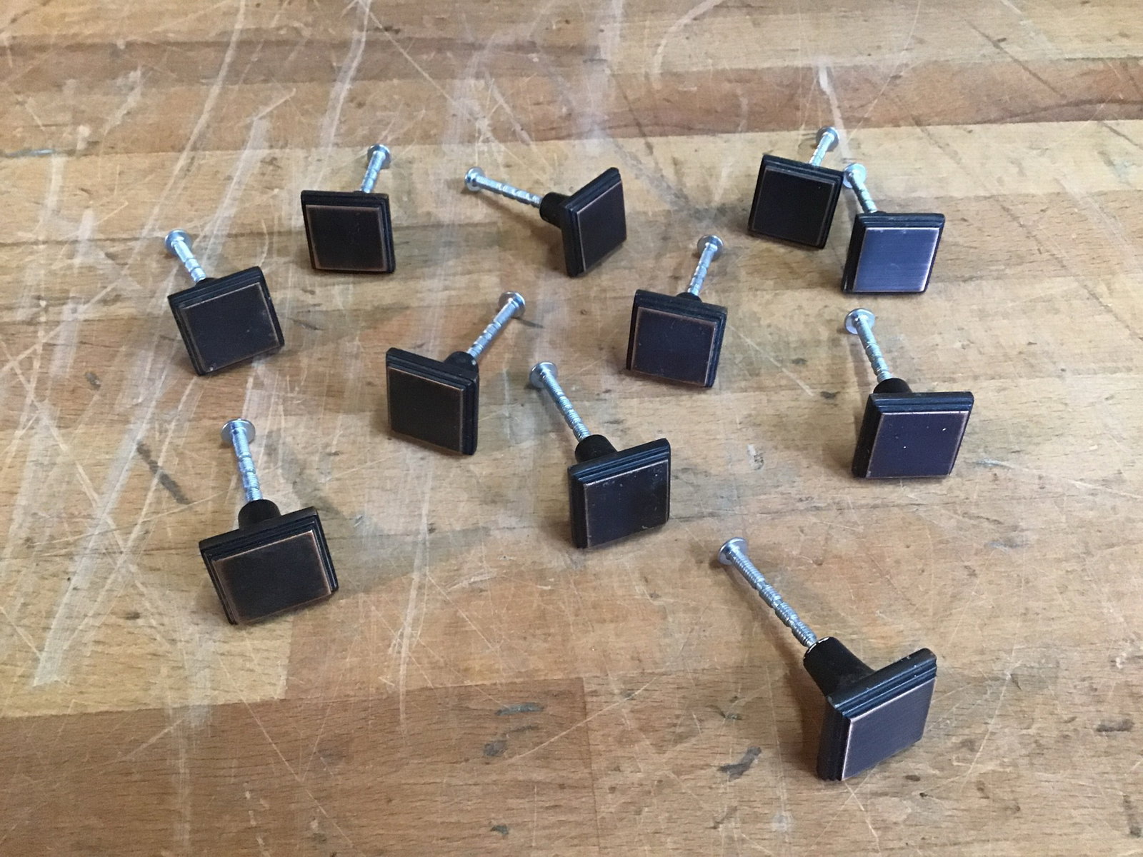 10 Oil rubbed bronze finished cabinet knobs in good, used condition. Photo may be representational.