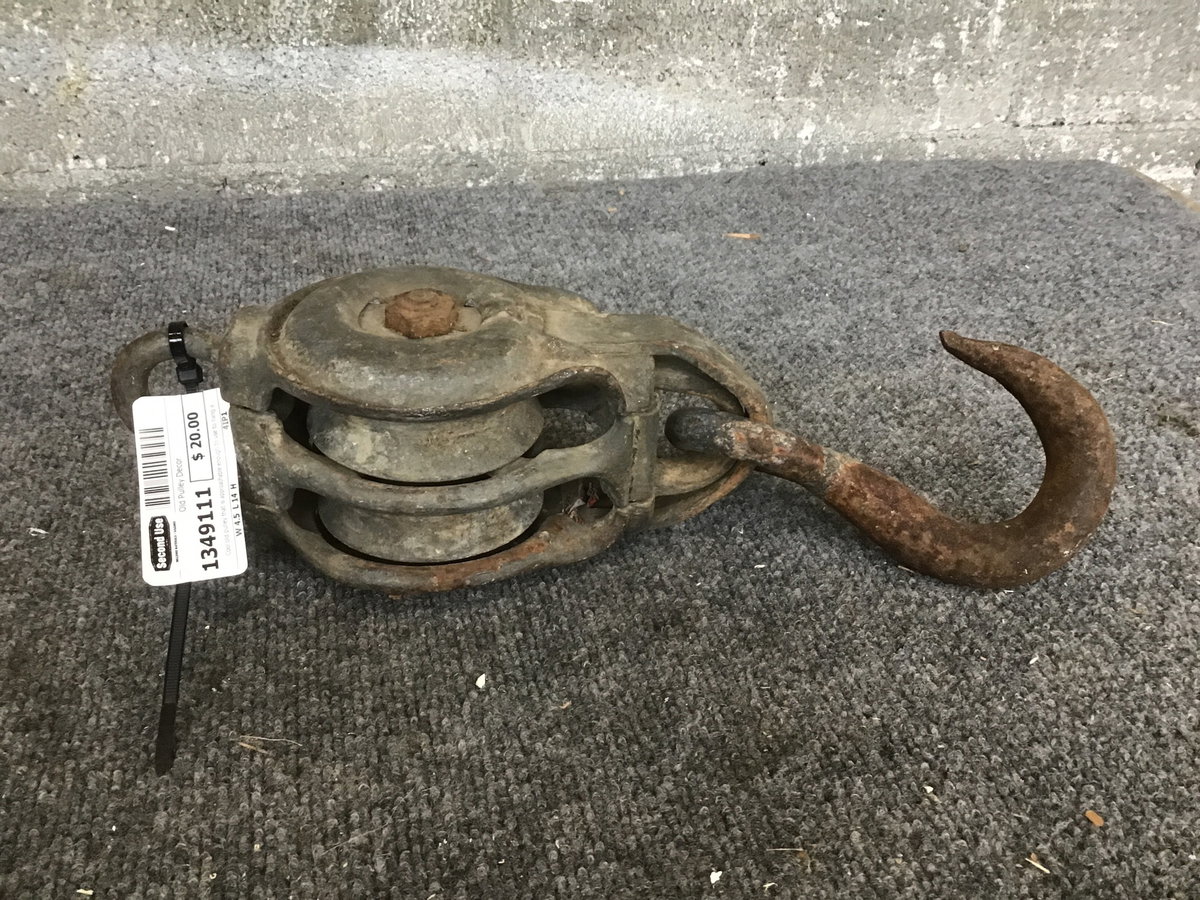 Cool old pulley that is approachable enough to use to hang a plant or lights on your patio! Alternatively, use as intended, it appears structurally competent.