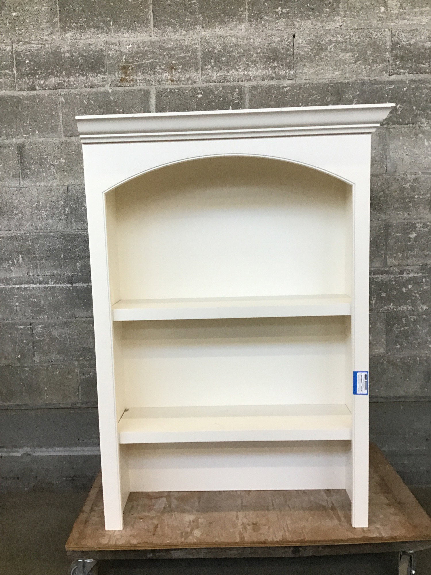 White painted open bookshelf that previously sat above a cabinet in a home office type setting. Check out other items on this job if you'd like to reunite them! Dimensions listed do not include the crown moulding. This one has a finished right side.