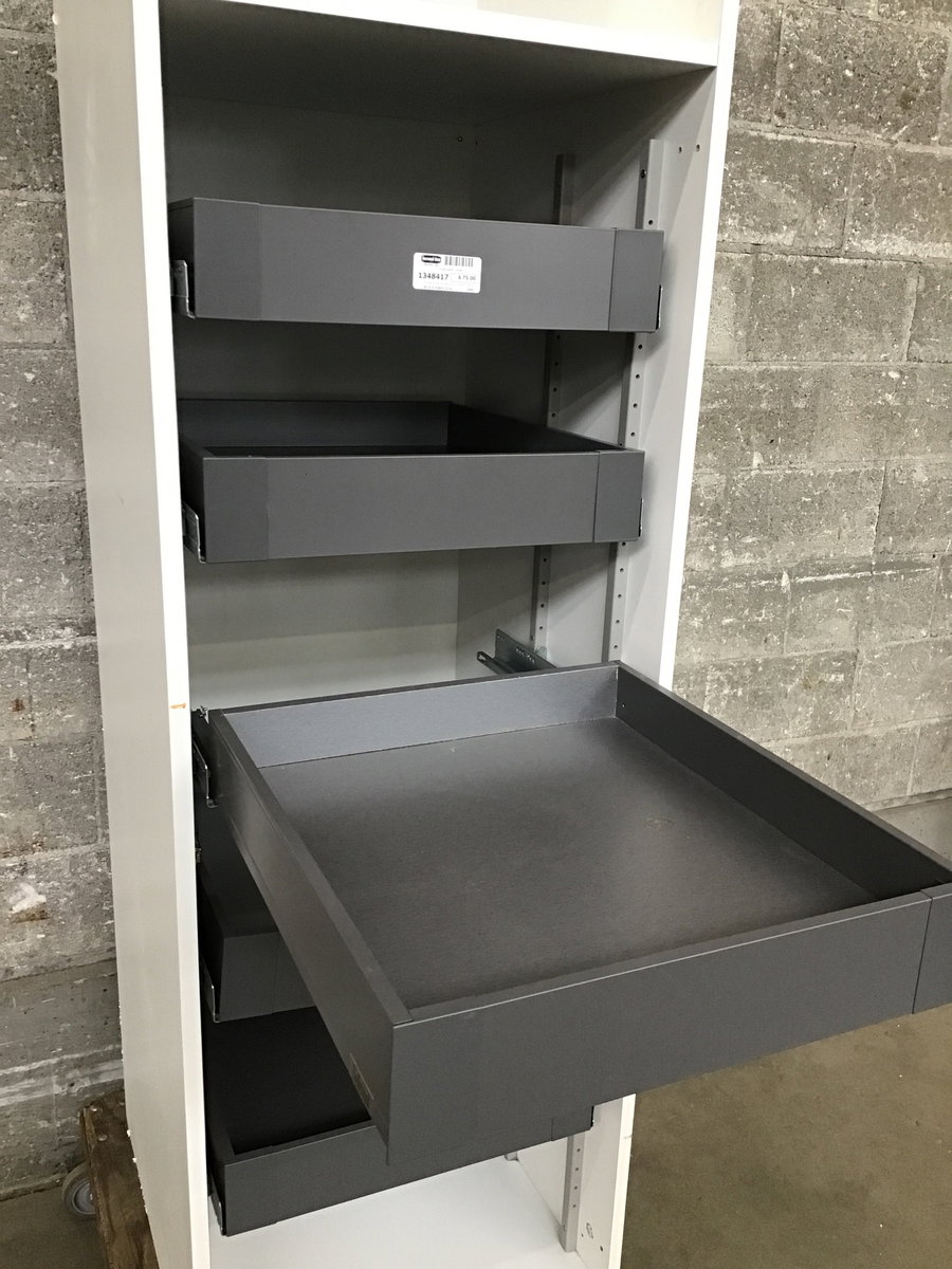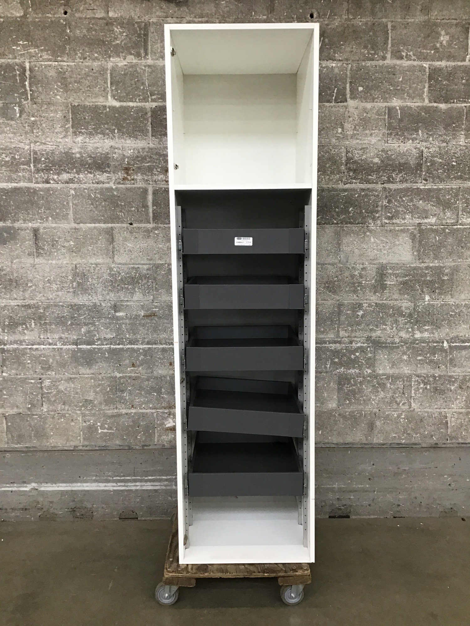 This looks to have once been part of a kitchen or laundry cabinet system. It's been separated from its brethren, however, and stripped of its doors, but it's still got a lot of use in it, with the highly adjustable drawer system inside which sports five drawers and the upper cubby space , making it a perfect organization center for your office, garage, or workshop!