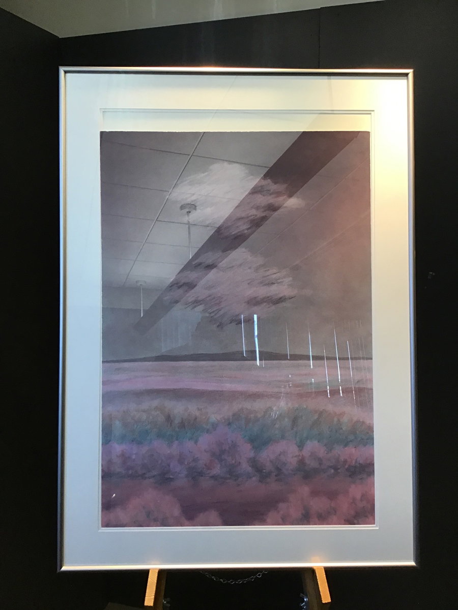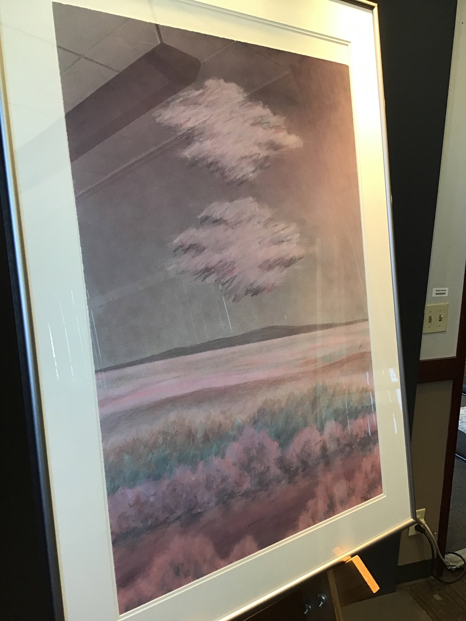 If your favorite color is pink or purple then this painting is for you! Painted on a thin piece of canvas and framed professionally, this gorgeous painting shows two clouds above a field of pink plains with a lone mountain in the background. No signature or artist information is available from what I can find but this is still a very pretty piece!