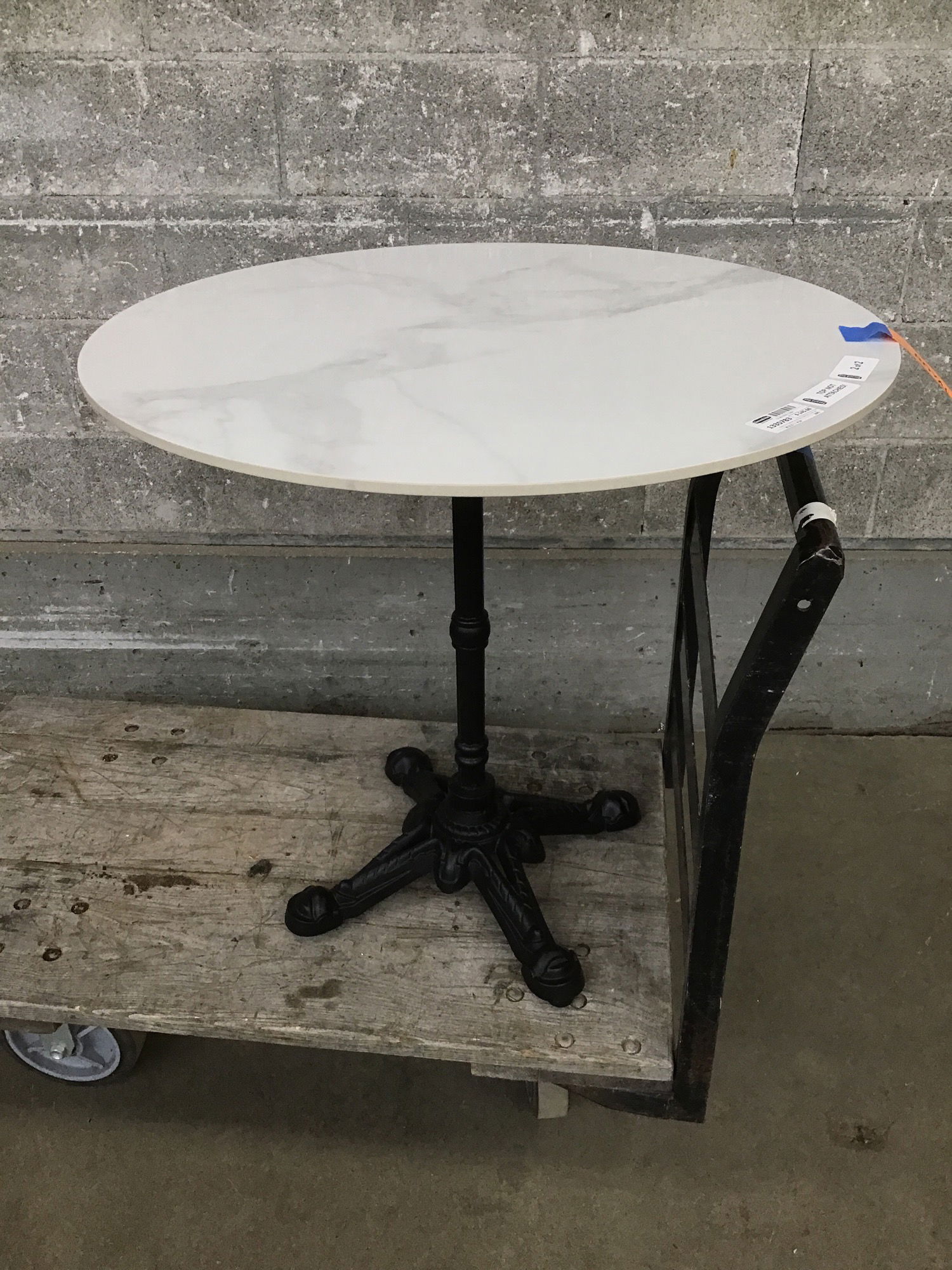 Modern but classically styled bistro table with ornate cast metal base and what looks to be a manufactured stone top. This table makes a stylish addition to your dining space whether it's indoors or out. Bring a touch of Paris-o to your pati-o! (Please comprehend my implied rhyme)