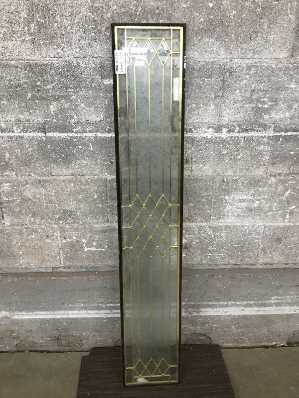 A pane of unframed thermopane glass that holds a beautifully ornate sidelite inside of it, with almost every kind of fancy obscured glass you can think of, bevel edges, and wavy glass panes. In total, there are about 51 different panes between the thermopanes.