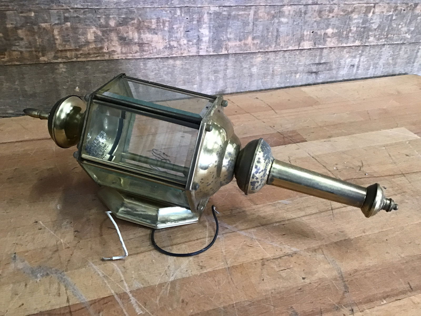 Outdoor wall sconce with a brass finish and beveled clear glass panes. There's some wear to the finish, but the wiring looks good and it is suitable for wet locations. Price reflects condition.