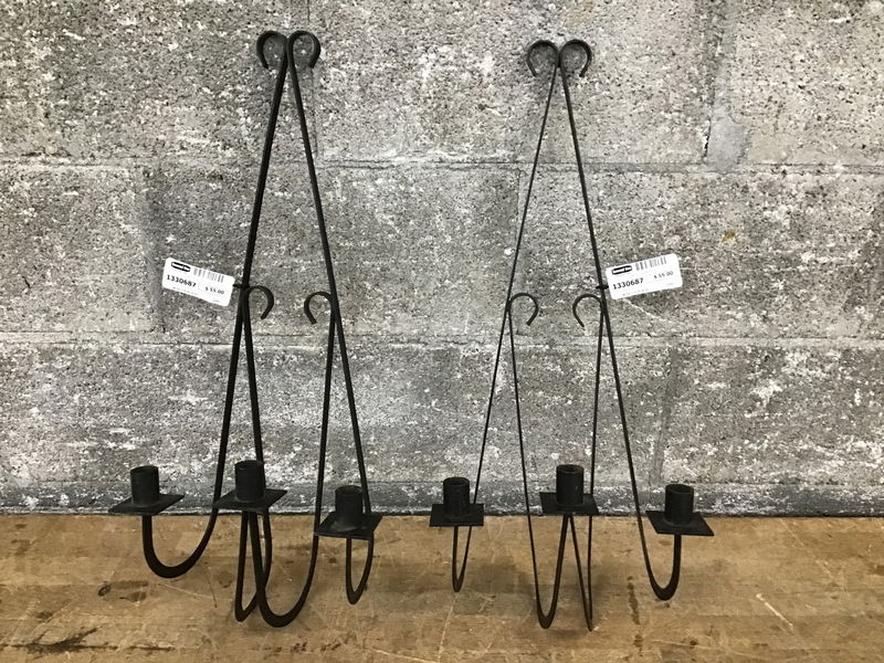 A pair of wall mount, wrought iron, mid-century candle holders. With a curly design, each holder holds three candles. Dimensions are for one holder.