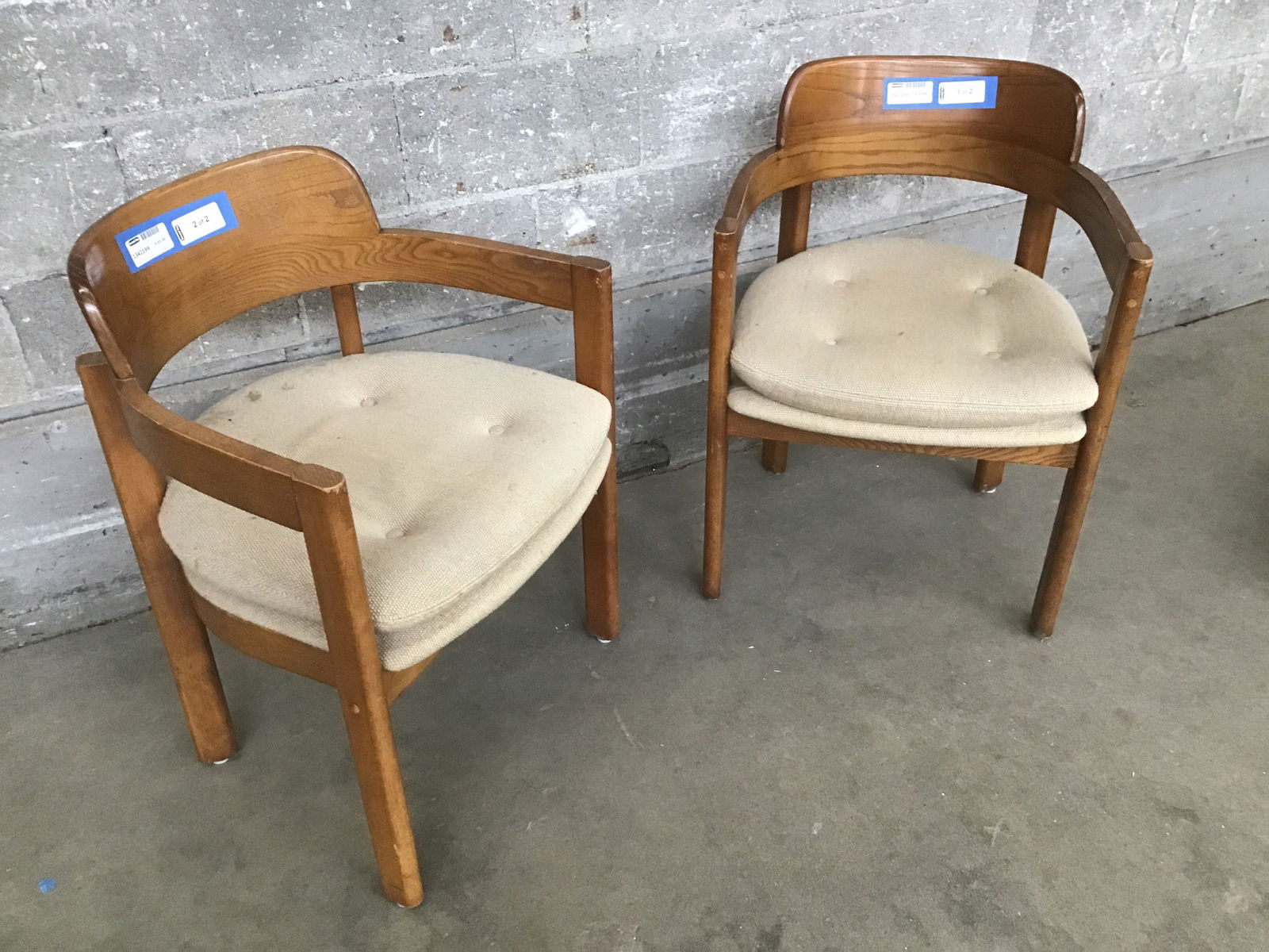 Pair of Mid Century curved back Oak chairs. The actual chairs are in good shape but you may wish to replace the cushions with something a bit more stylish.