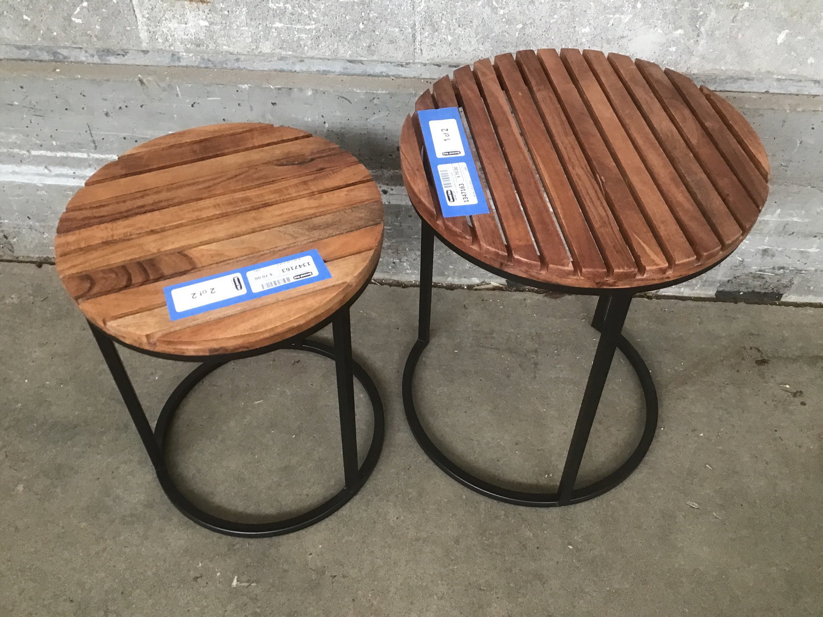 This is a pair of slatted side table that are made from walnut and have matte black steel frames. Dimensions listed are for the larger one. Smaller table measures at 14" diameter and 17" tall.