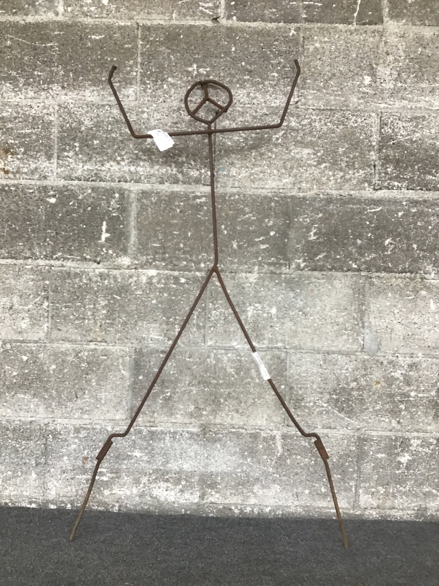 Steel rod constructed yard art stick figure with a peace sign for a head. Looksl like it should stake into the ground.