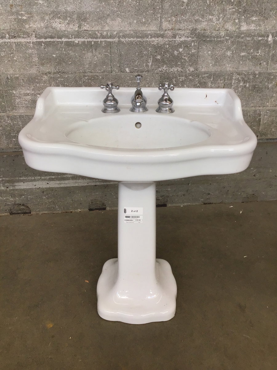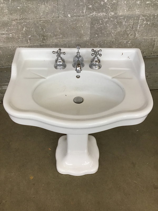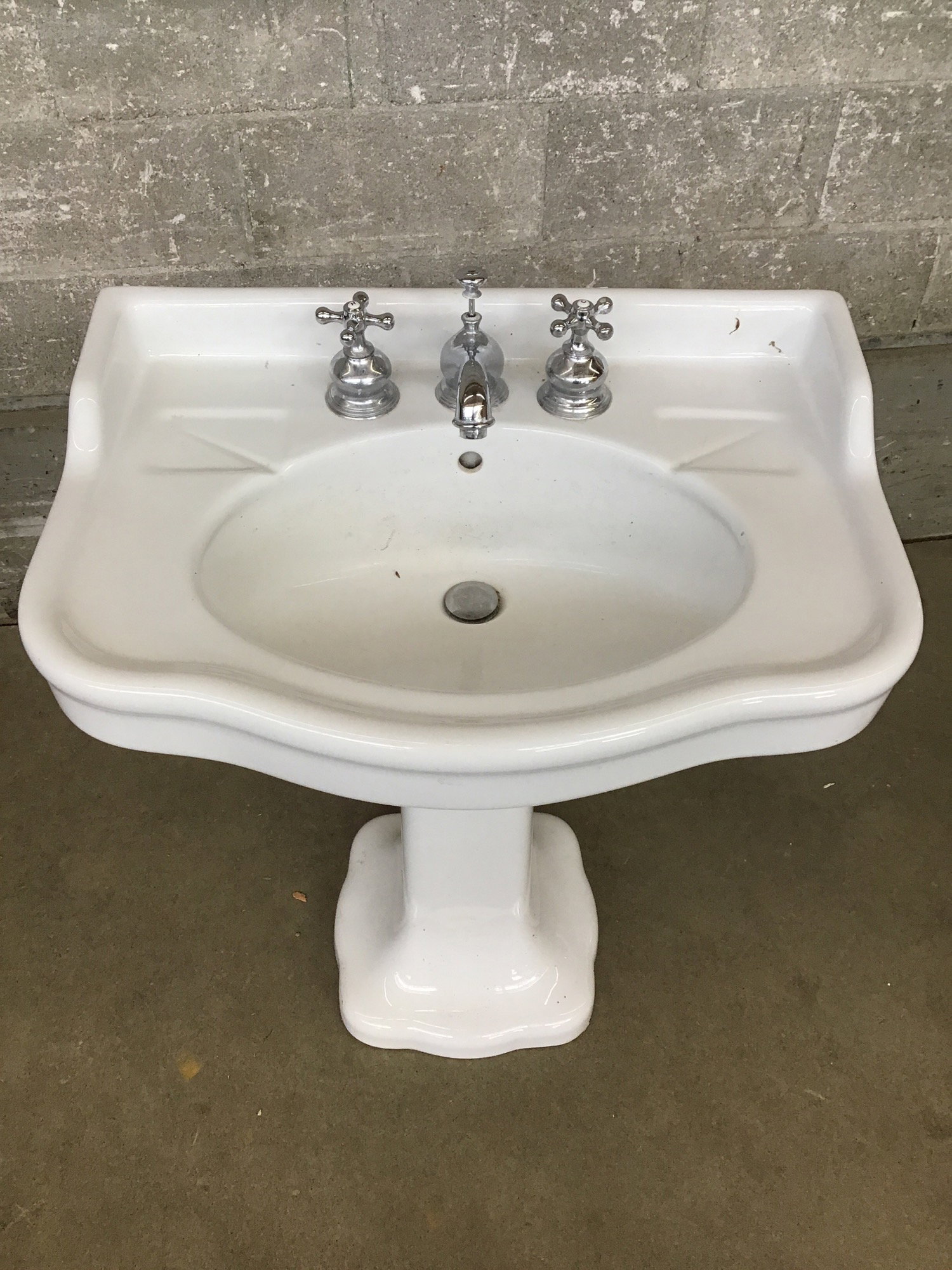 White porcelain pedestal sink featuring two soap indentations, a chrome faucet and an integrated backsplash.