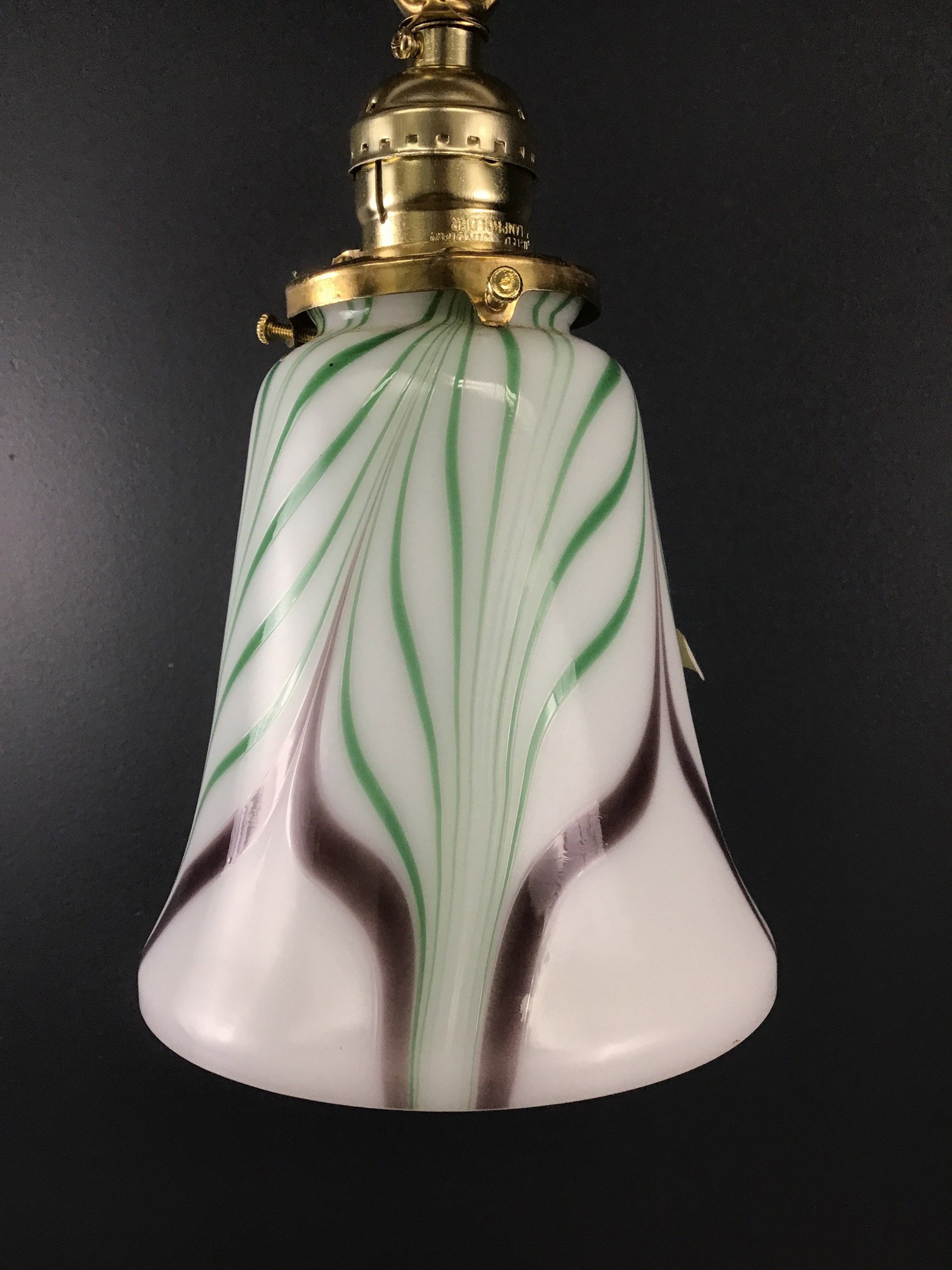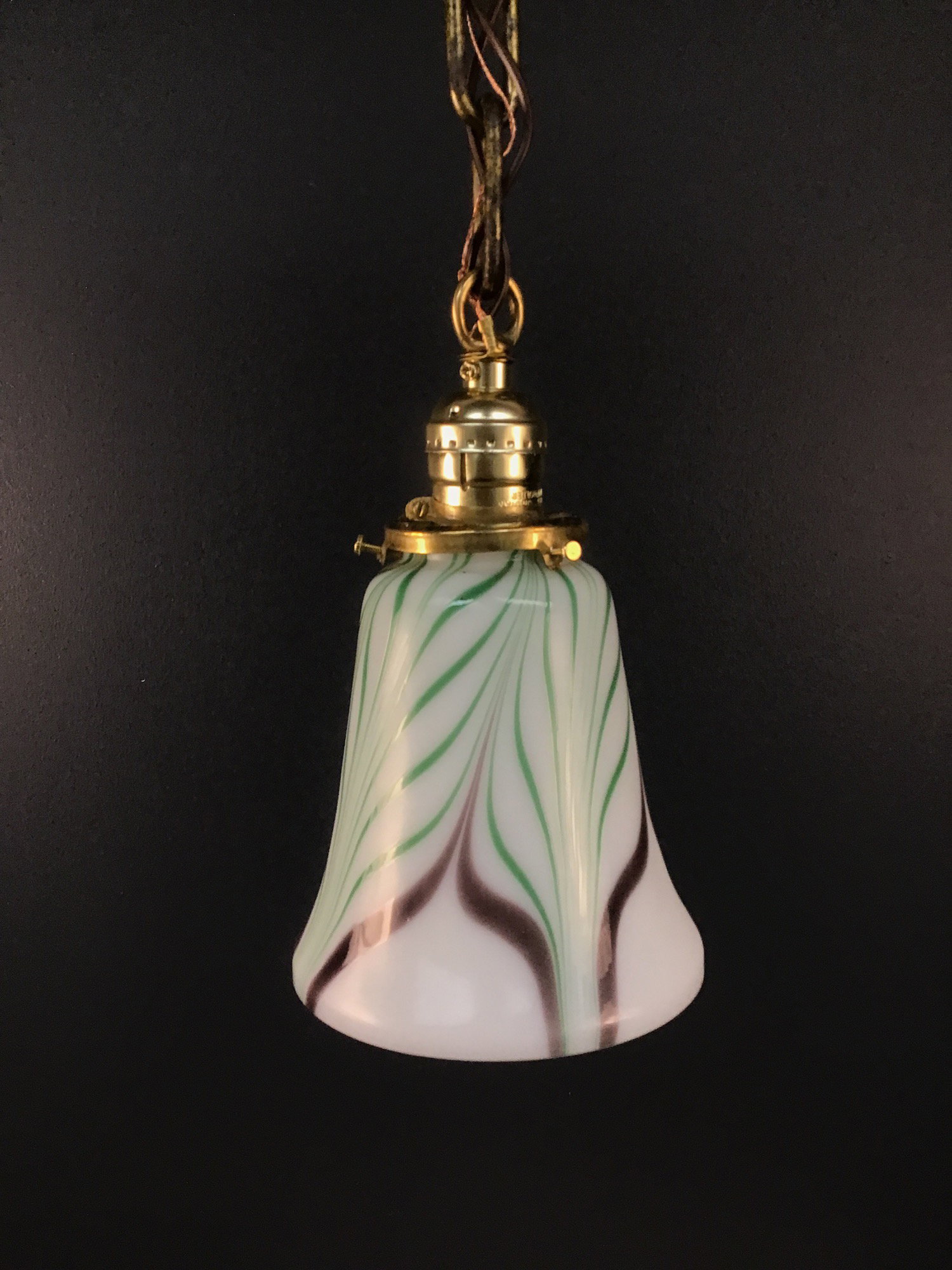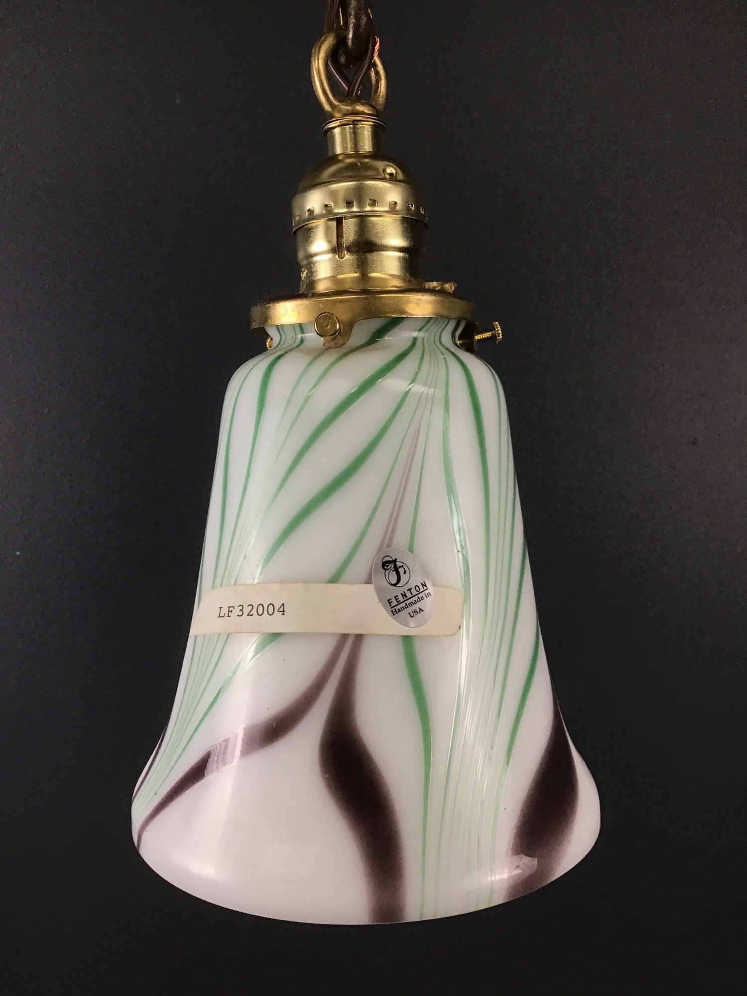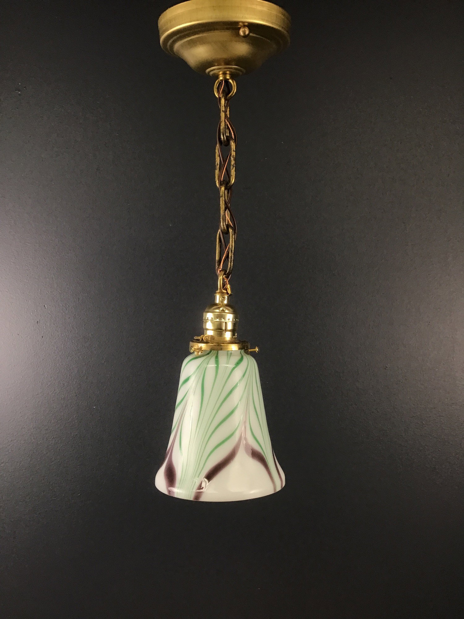 A gorgeous green and purple feather on white hand blown art glass bell shade made by Fenton hangs on a brass chain drop base that was made in our on site light repair shop using new and antique parts. The shade still has it's Fenton sticker, as well as the lot number! Just lovely!