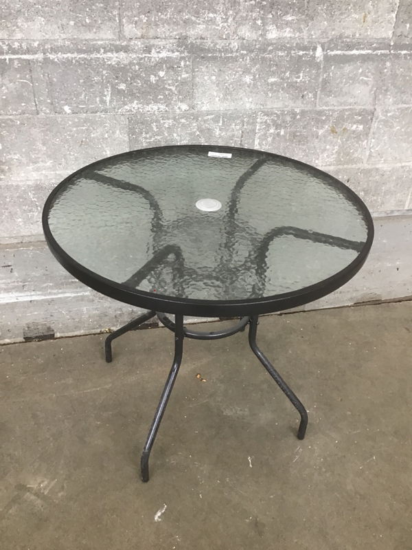 This patio table features a solid metal frame, obscured and tempered glass top and a hole for an umbrella. Never too soon to start planning for summer chill outs.