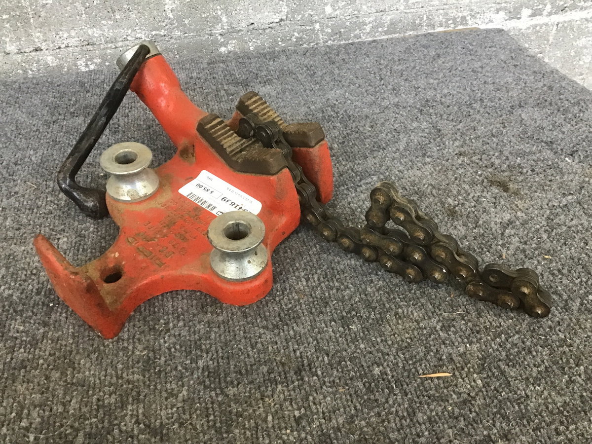 A RIDGID BC-410 bench chain vise that fits pipes 1/8" to 4" in diameter and seems to be in great shape. Retails new for about $250.
