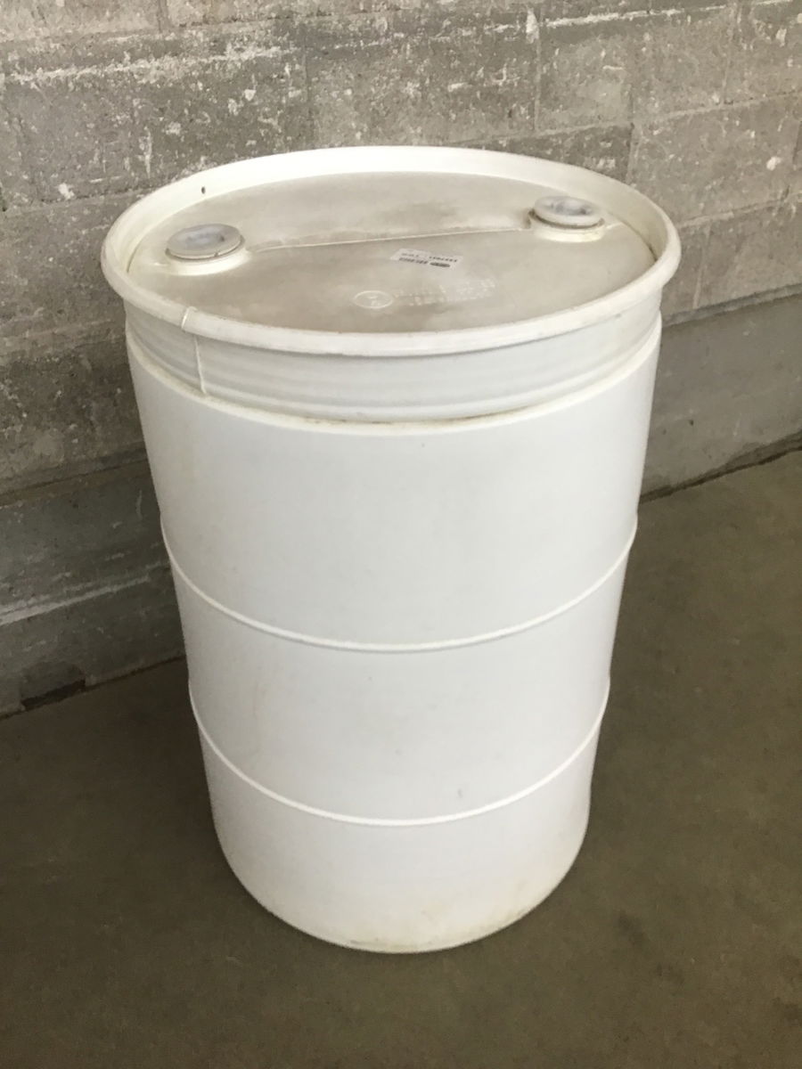 White plastic rain barrel