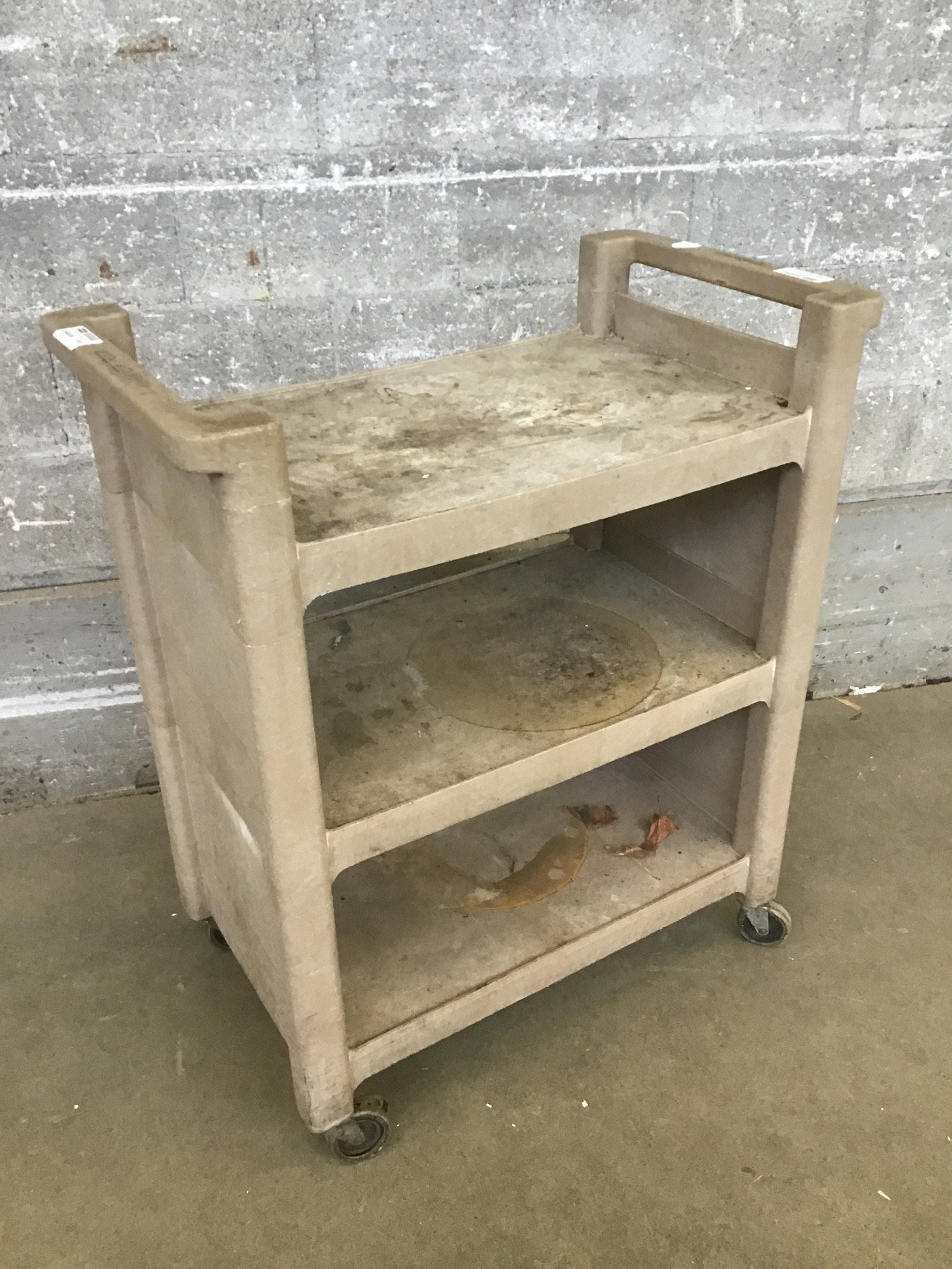 A decent looking plastic Rubbermaid push cart with four smoothly rolling casters. This lil dude is a bit dirty and will need a good wipe down and the price reflects.