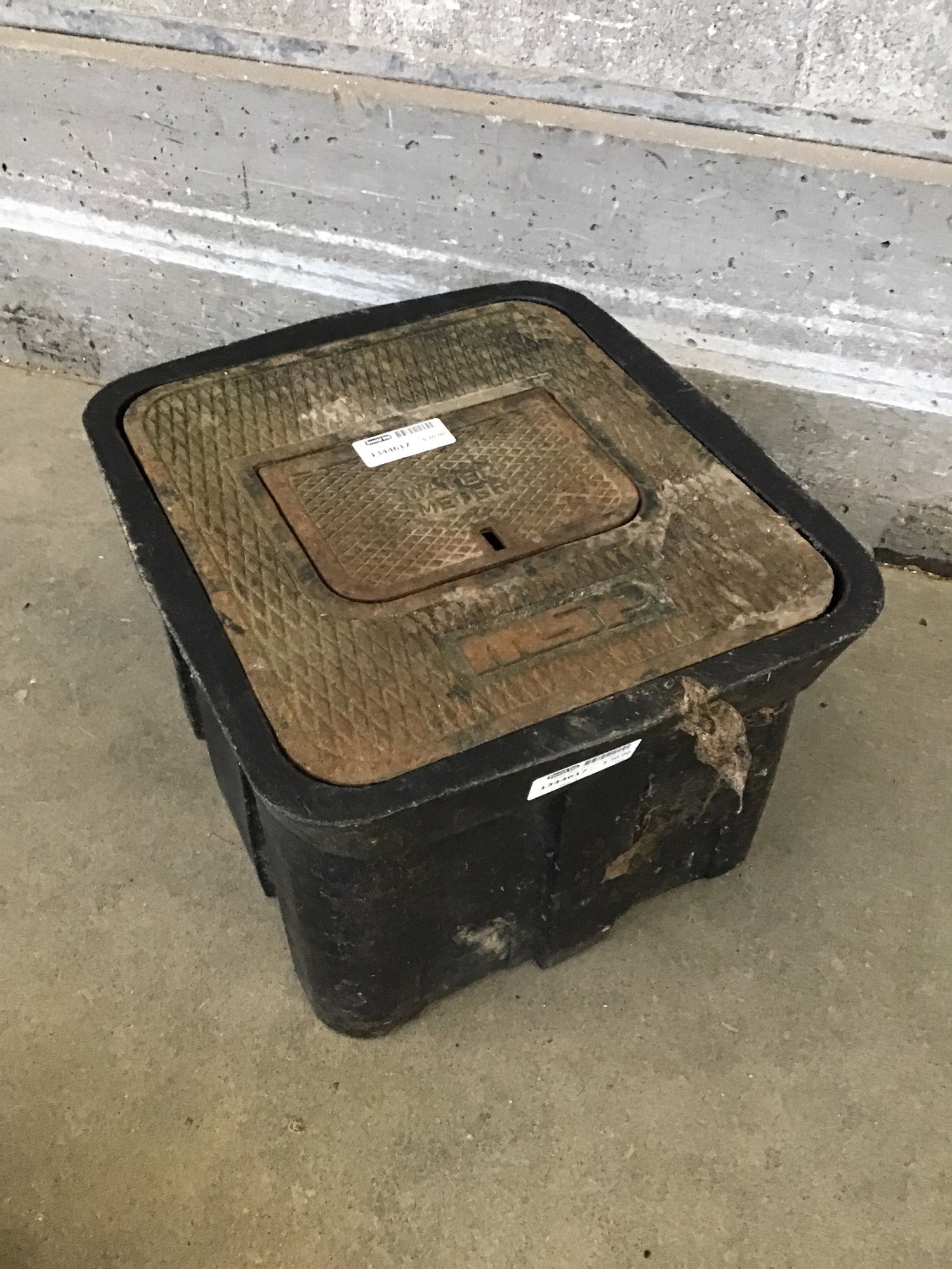 A decent looking water meter box with a hard plastic housing and a cast iron lid. 17.25(w)x19.25(L)x12(h) in inches.