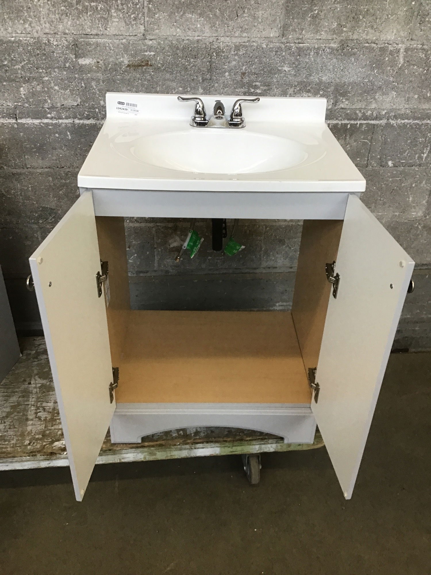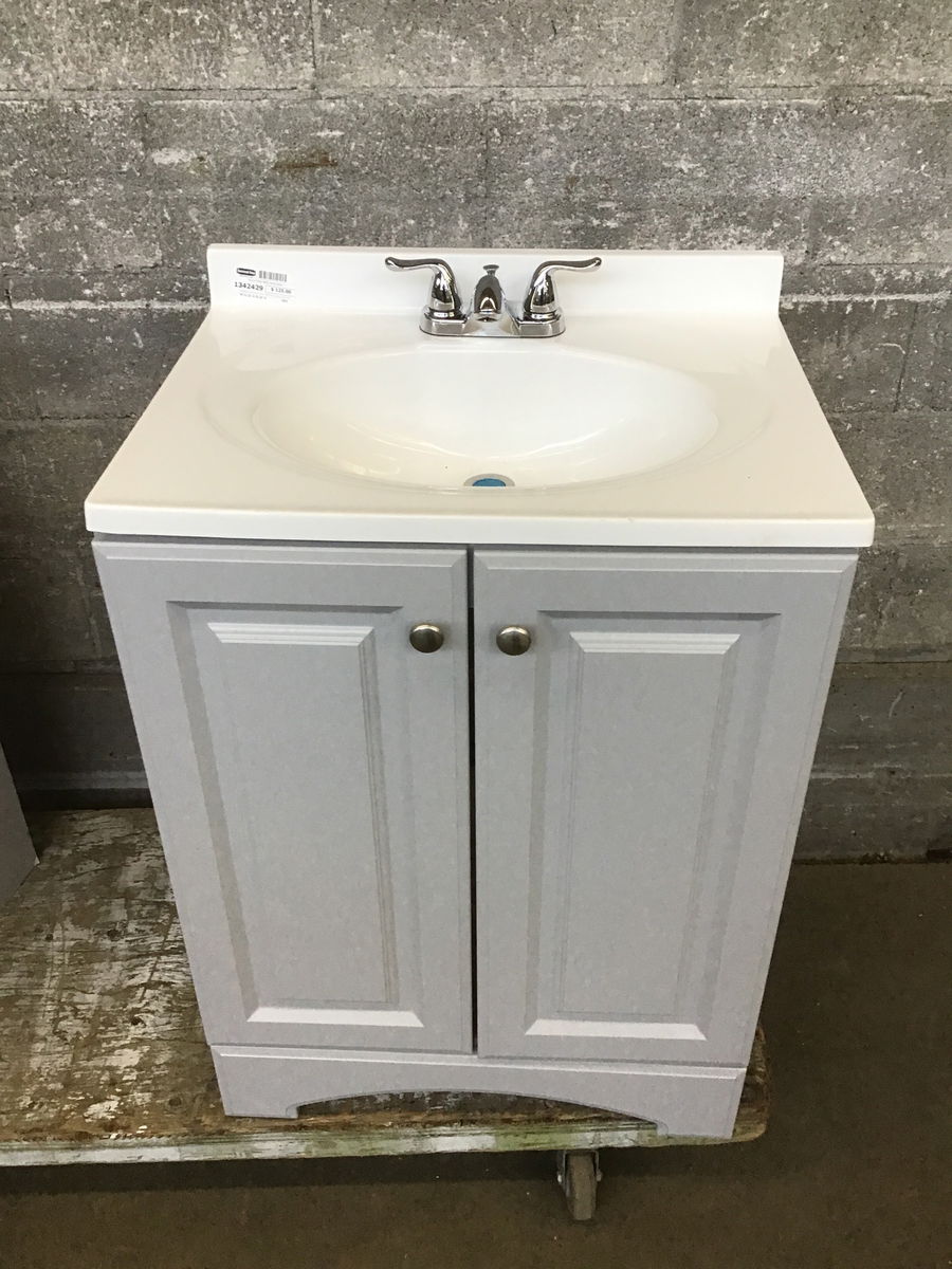 Freestanding bathroom vanity base with a single piece sink/countertop combo and chrome faucet. Lightly used good condition. No paint chips or swelling. Listed measurement is to the front of the counter and does not include the 2.5" backsplash.