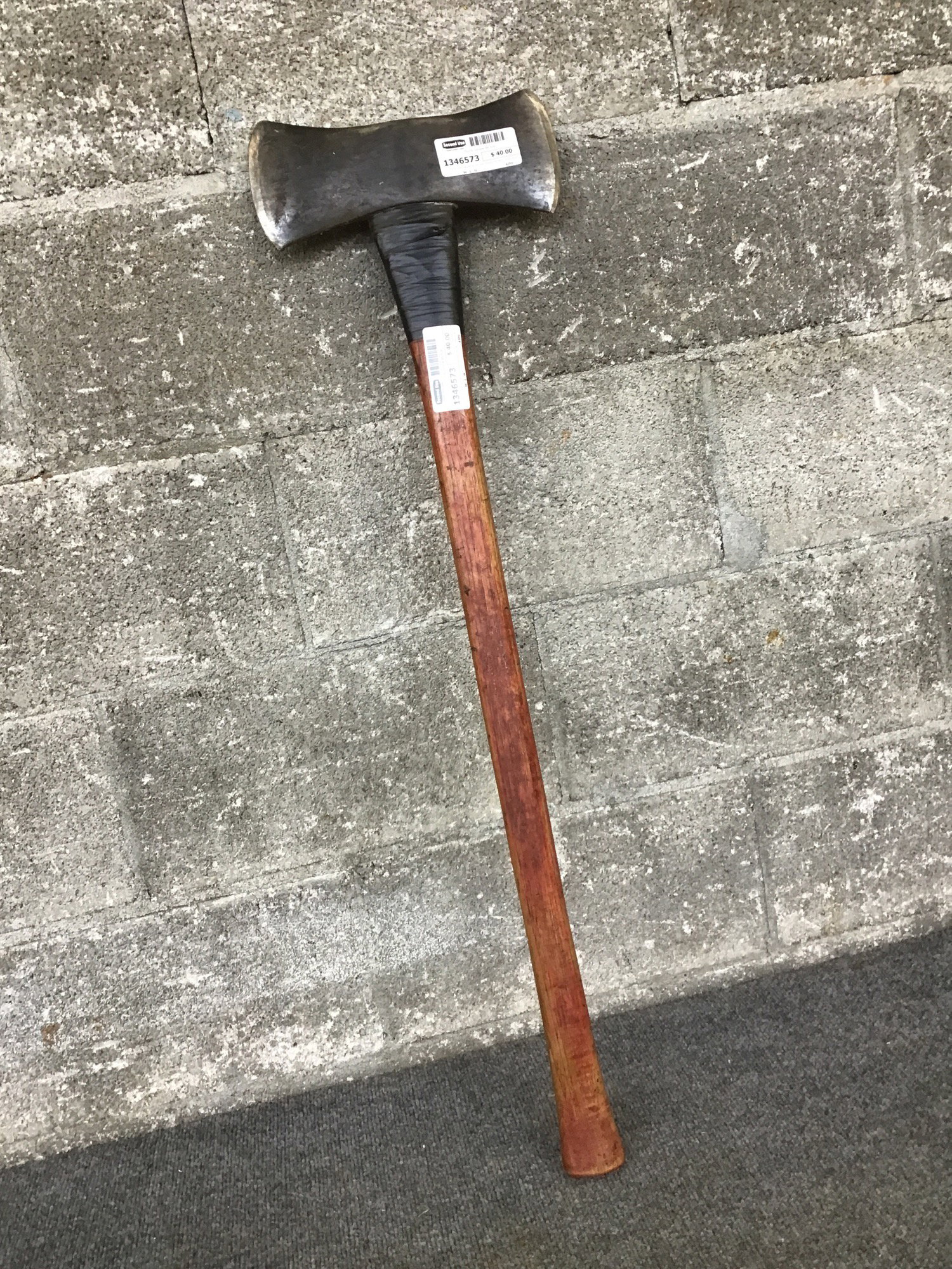 Plumb brand double-bit axe with wooden handle in pretty good condition. There is some electrical tape near the head. Logo is readable and blade is rust free. Handle has some scratches on it. Fully prepared to offer your help to a fellowship embarking on a world-saving quest.