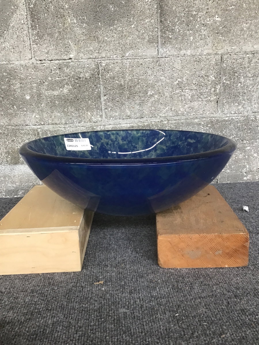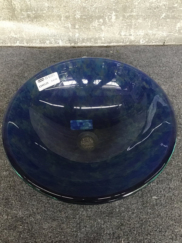 Molted blue tones on this thick glass vessel sink.