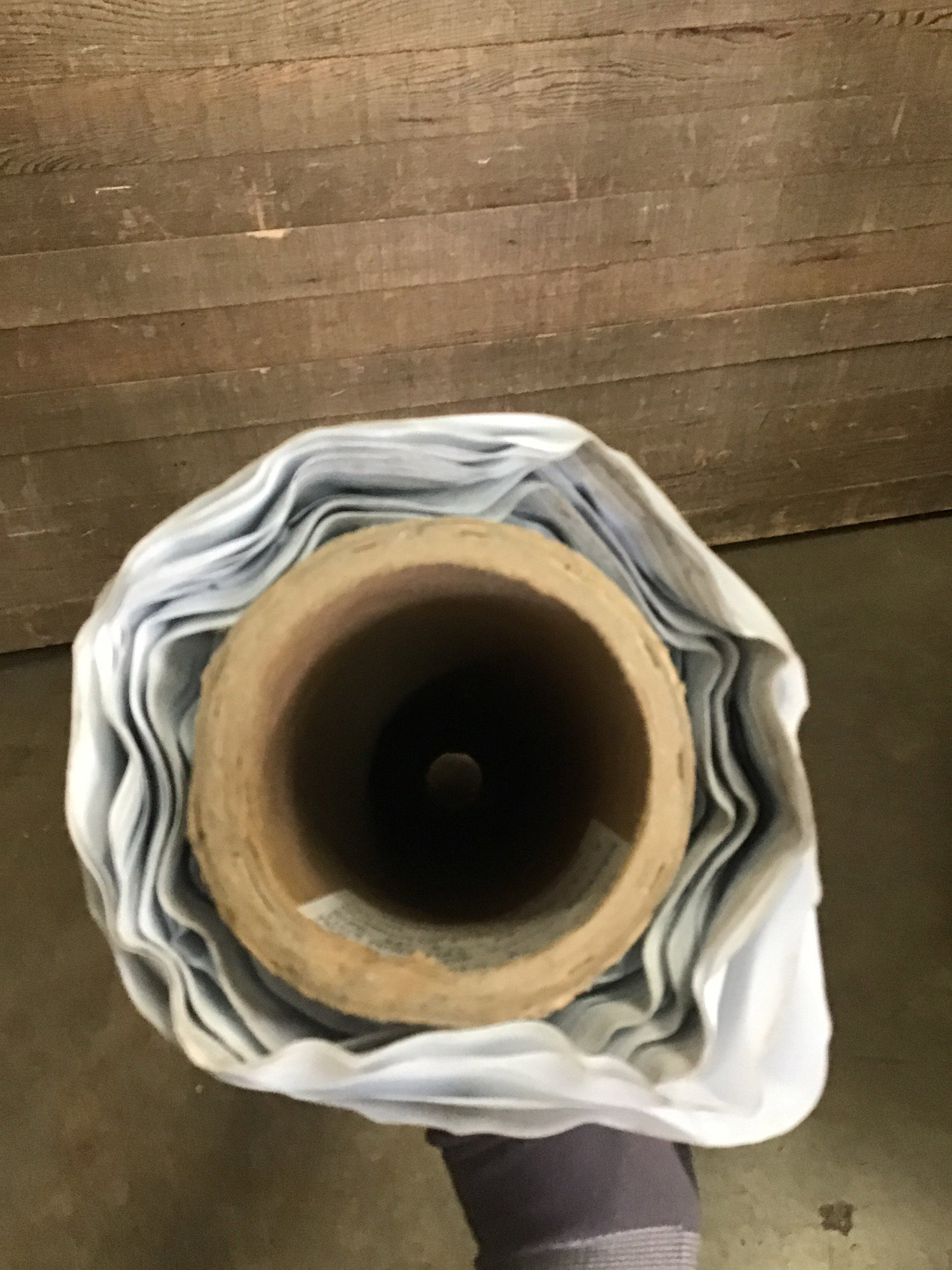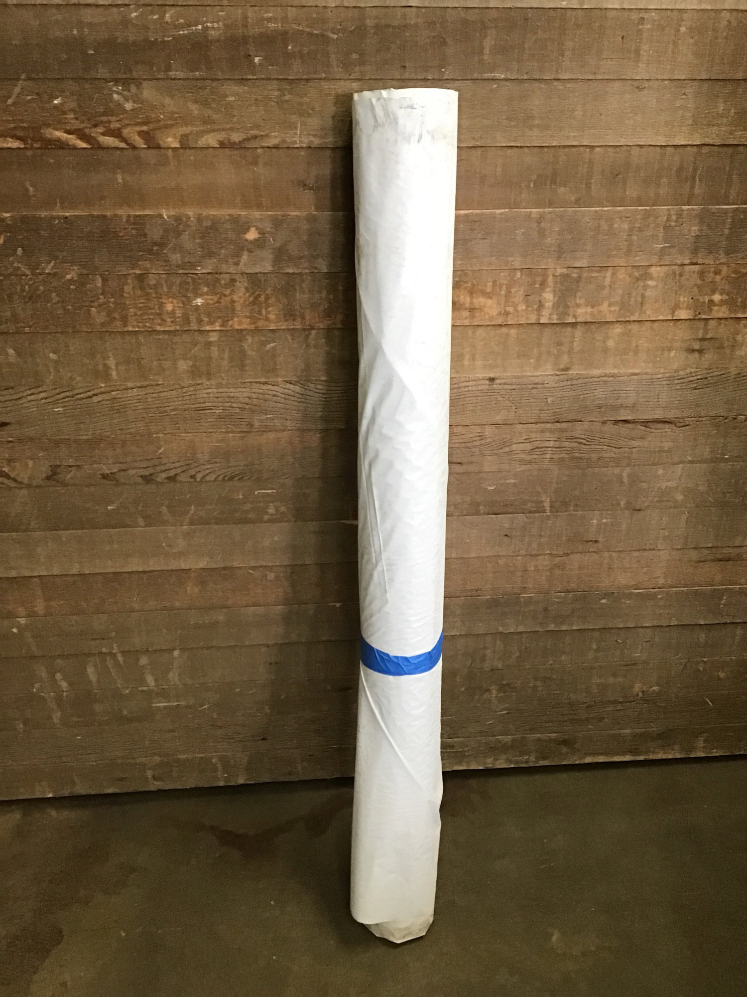 Big ol' roll of Proflex vinyl drape, 54" in width. An unknown length has been used, though there is still a fair amount left. Originally a 53' roll, and I'd guess there's at least half of that left. Diameter is about 5"