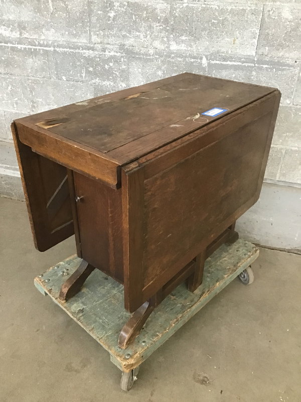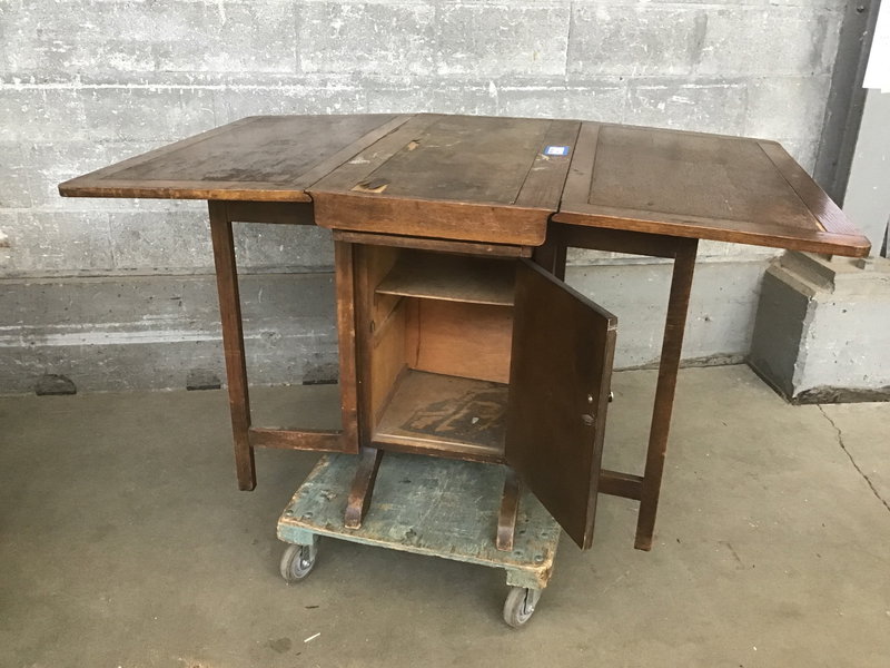 This vintage drop-leaf dining table has seen better days for sure. The top is coming off in a few spots, there are stains, and just overall pretty rough. The drop leaves are pretty decent in comparison. There is oddly some cabinet storage space on either end of the table, so that is pretty cool.