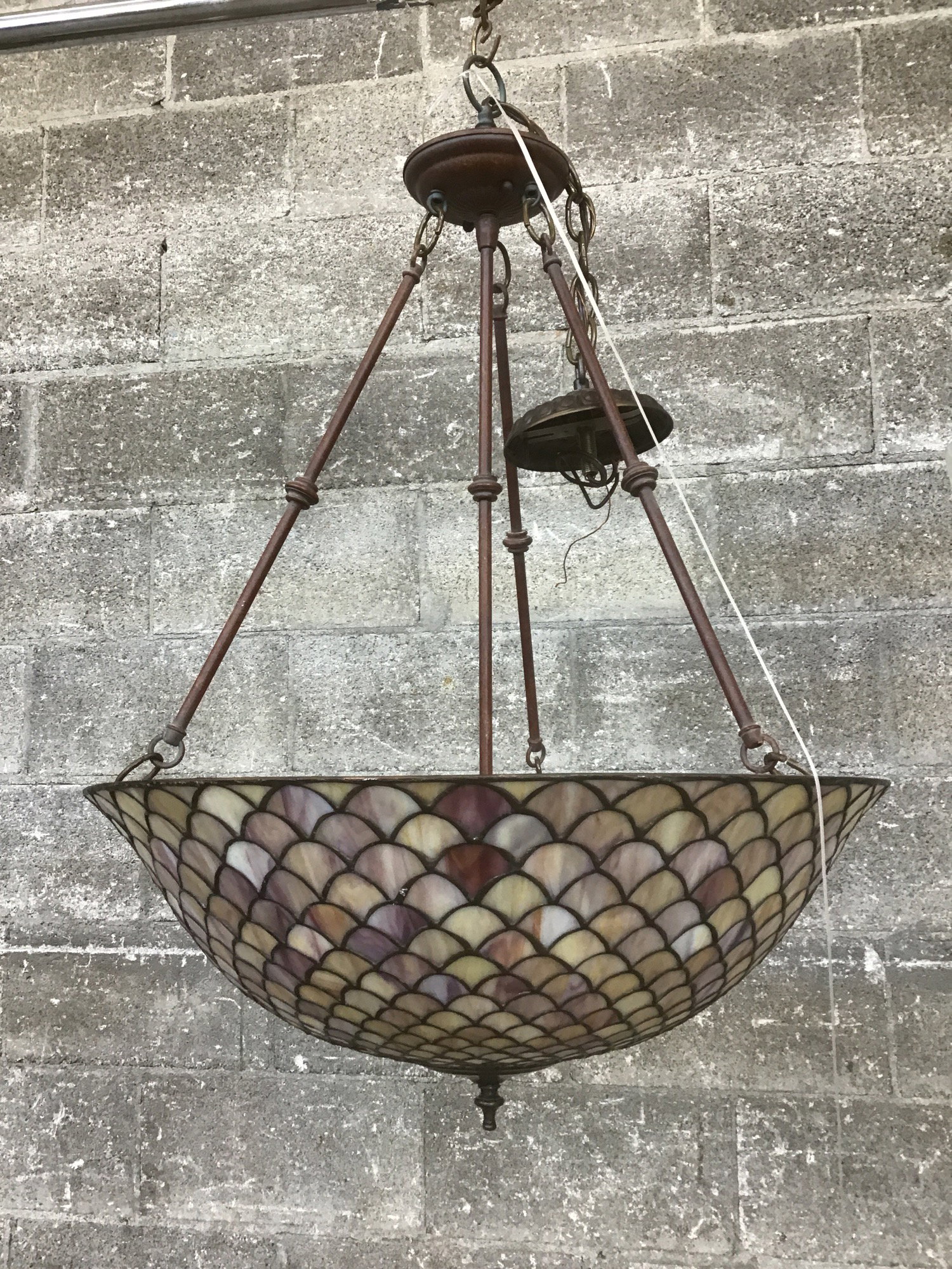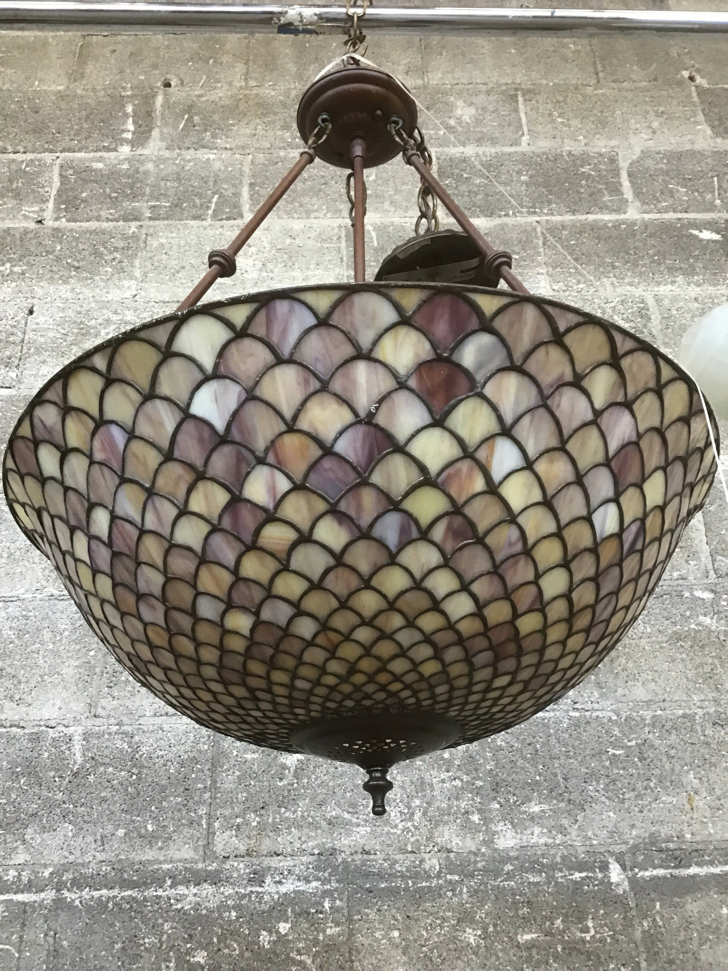 Glamorous stained glass "fishscale"-style light from Quoizel. In beautiful shape, I couldn't spot a single crack in any of the scales. The shade is held in place with three rigid arms and a central pole. Takes six candelabra bulbs.