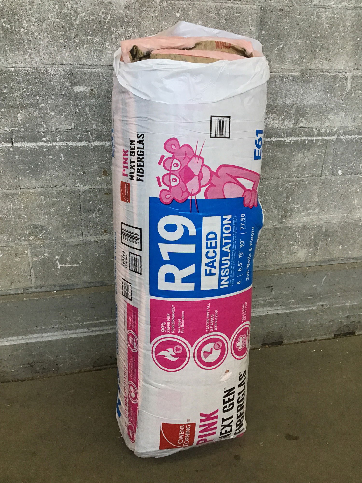 New bag of Owens Corning R19 insulation for 2x6 walls. Bag contains ~77.5 SF of coverage, 8 pieces total.