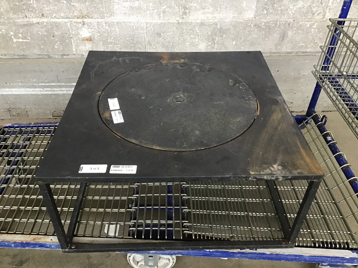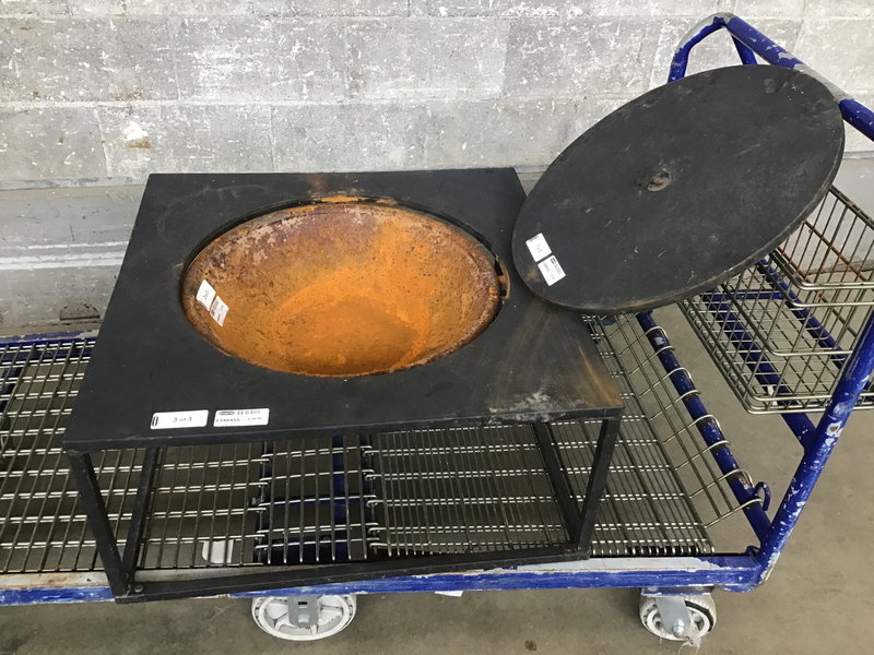 Lightweight steel fire pit with a removable basin and lid. The bowl has quite a bit of rust but may still have a season or two in it. You could totally swap it out, as the table / frame is in fine shape.