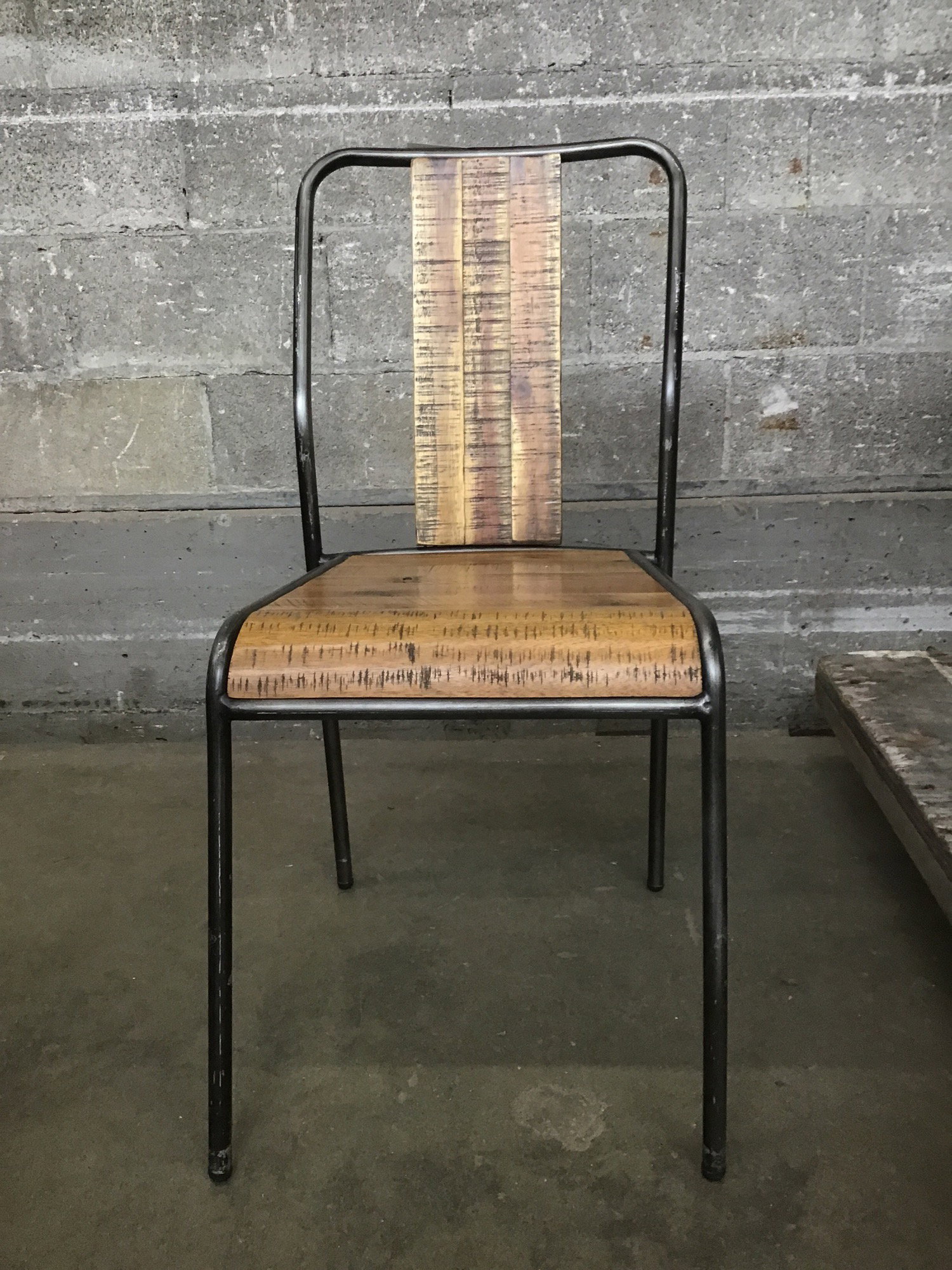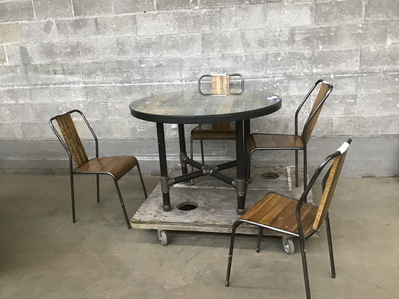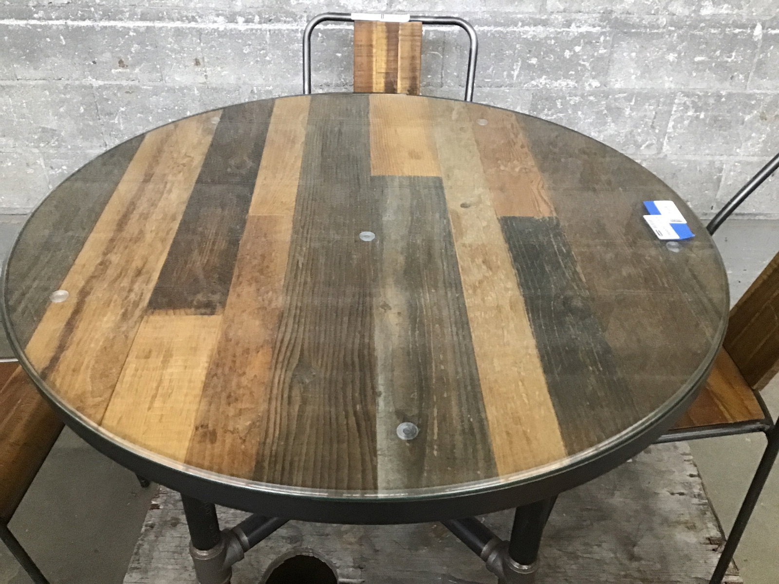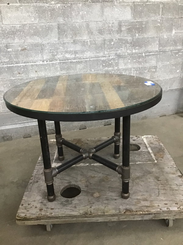 Well-made, box store/mass-produced reclaimed barnwood and pipe steel table with four matching chairs. It has average cosmetic wear on the chairs but overall in great shape. Table includes a tempered glass top. It definitely has a vibe but would fit nicely in a gender neutral clubhouse ;) Sold as a set.