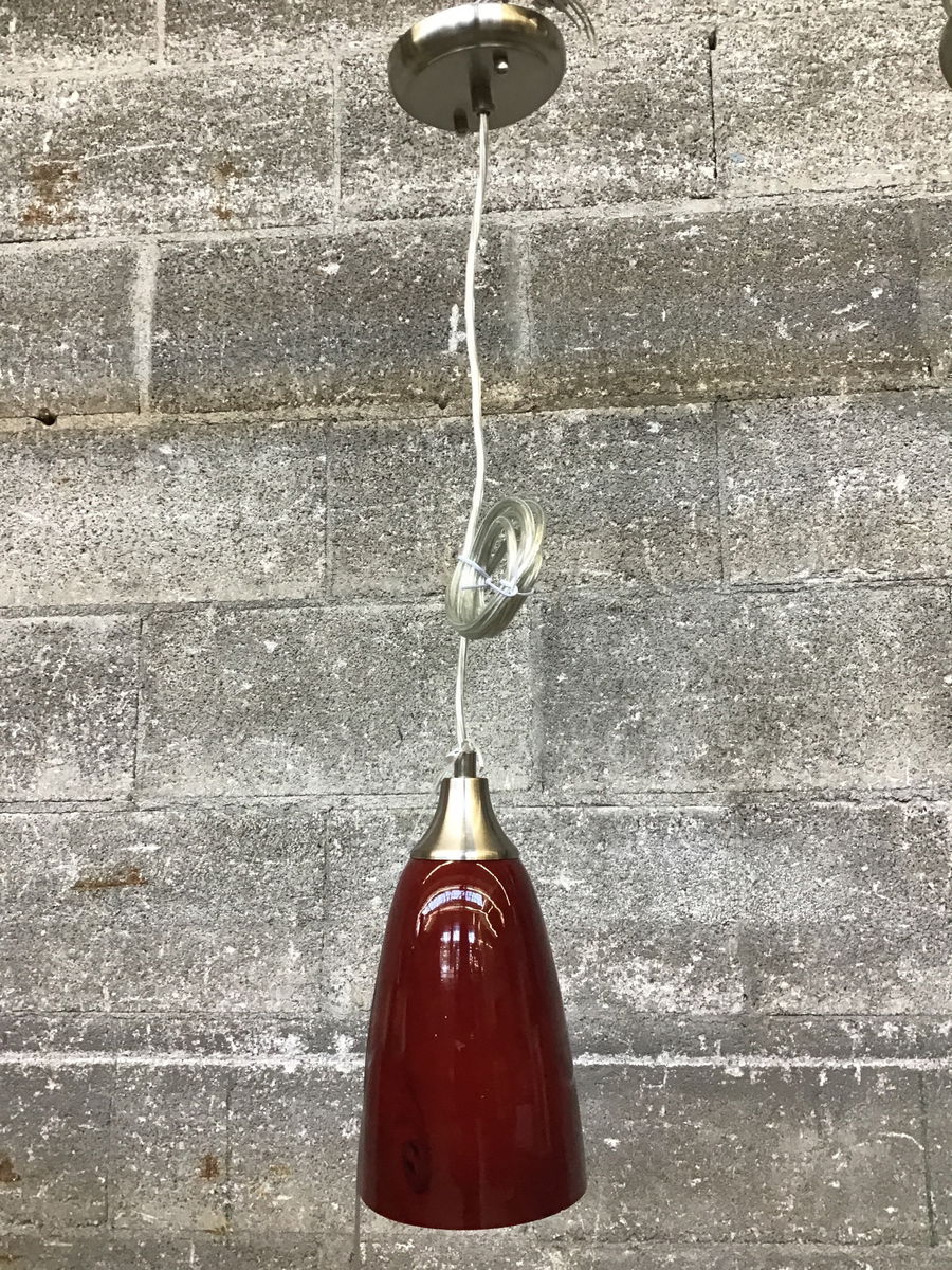 A pendant with a nickel finish to its construction and a red swirly glass fitter to its bulb.