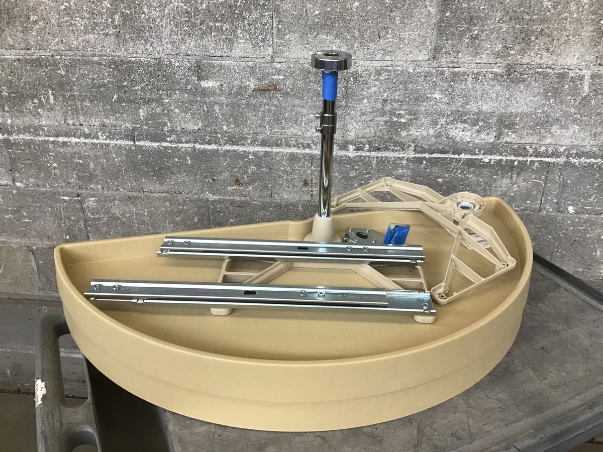 Rev-A-Shelf half moon pivot / slide lazy susan with plastic trays in a sandy shade. These are great for improving access to all those goodies that get lost in the back of your (blind) corner cabinet!