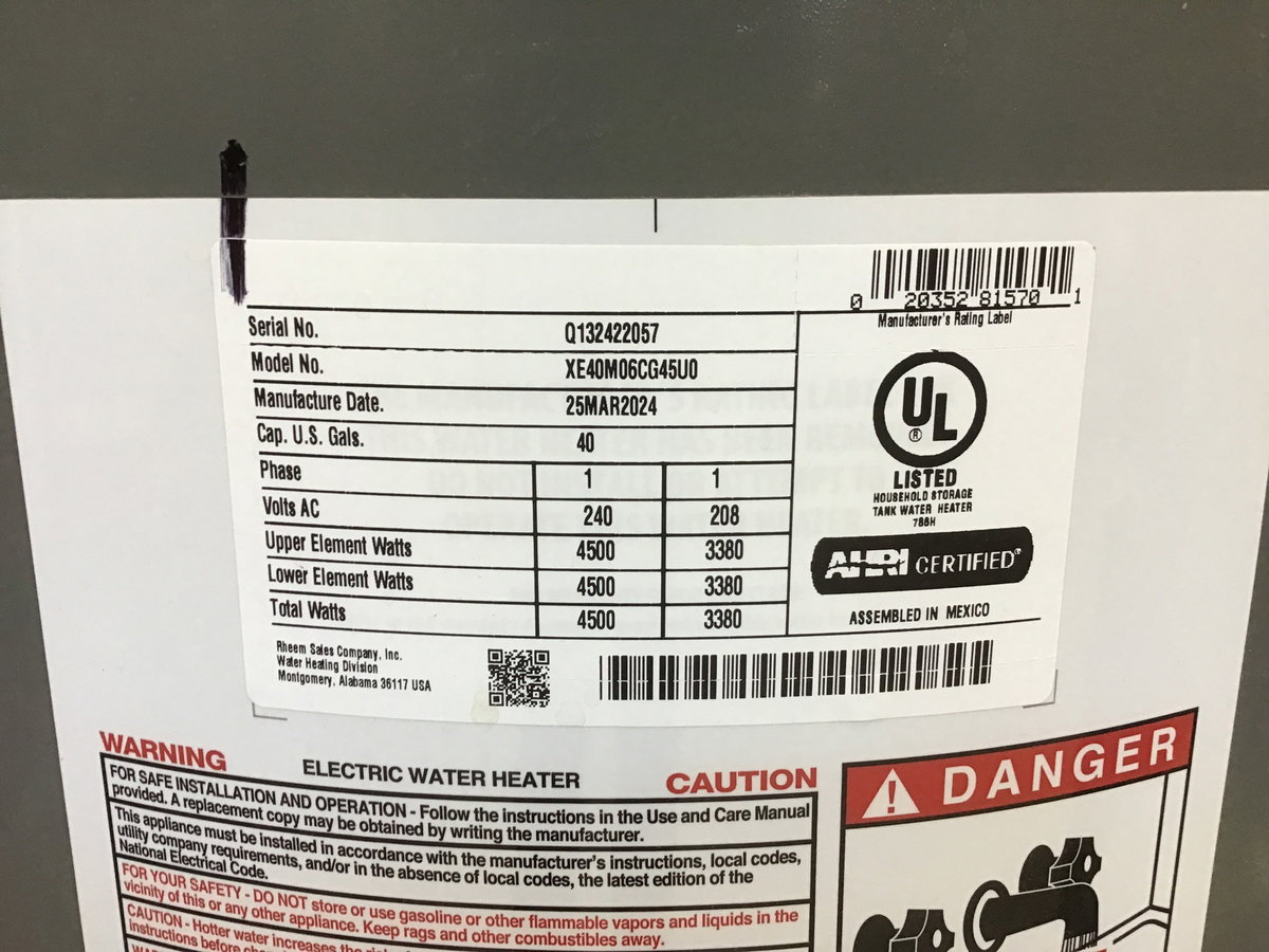 Ca. 2024 Rheem Performance electric water heater with a 40 gallon capacity. While we are unable to really test these in house, this one was filled with piping hot water when our salvage team extracted it from its previous home.