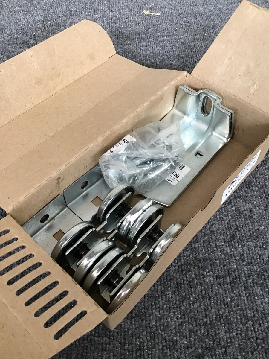 Box rail hanger set. Included 2 sets of wheels and mounting hardware. More info here.